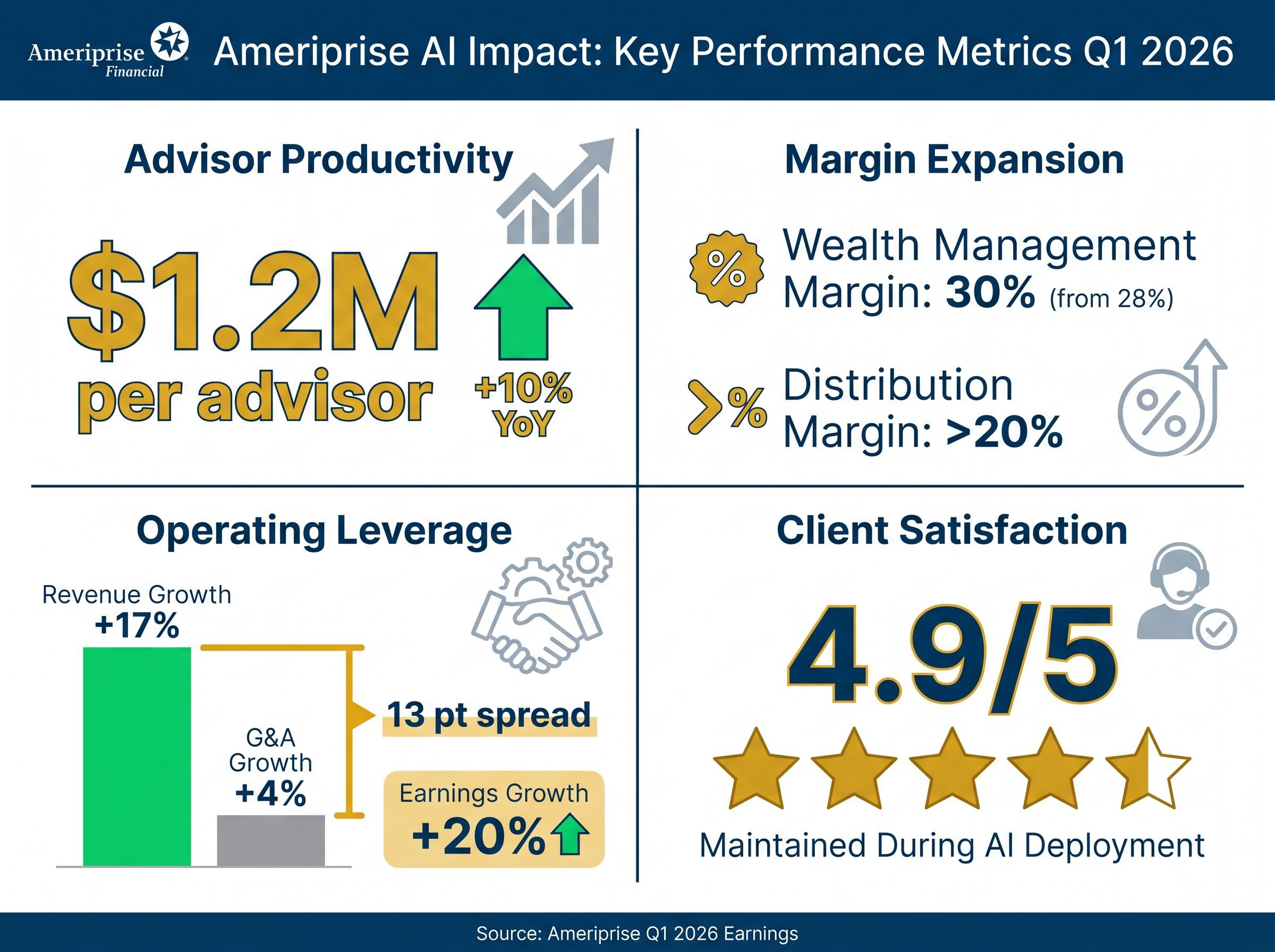 Ameriprise’s results show 10% advisor productivity growth, a 13 percentage point spread between revenue growth and G&A growth, and maintained 4.9 out of 5 satisfaction scores. These metrics triangulate to suggest the AI deployment is creating value rather than simply redistributing it from service quality to margins.