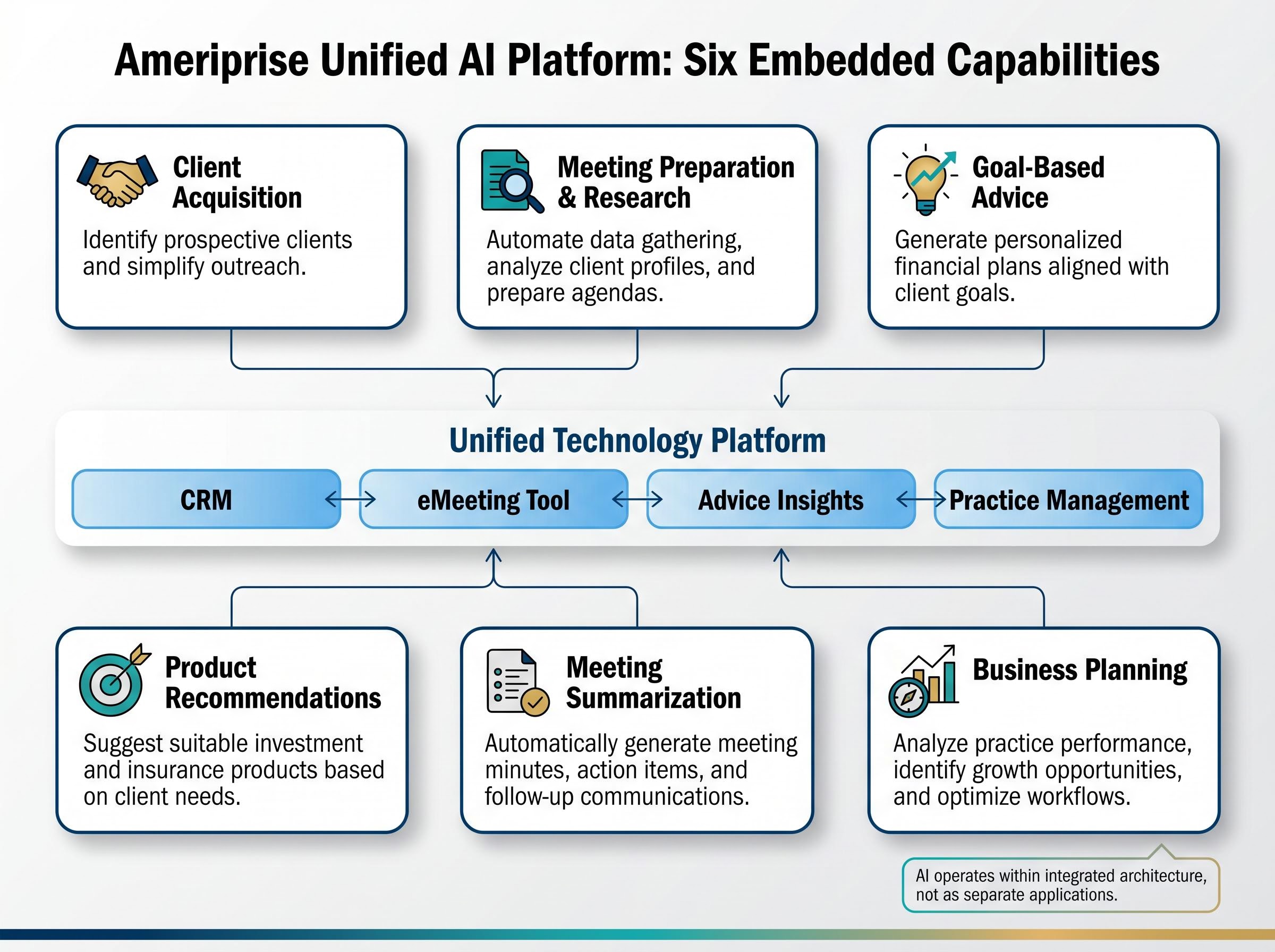 Ameriprise has constructed a unified technology platform that connects client relationship management, the eMeeting tool, advice insights, and practice management systems into a single operational ecosystem. AI operates within this integrated architecture rather than as a separate application requiring advisors to switch contexts or manually transfer data between systems.