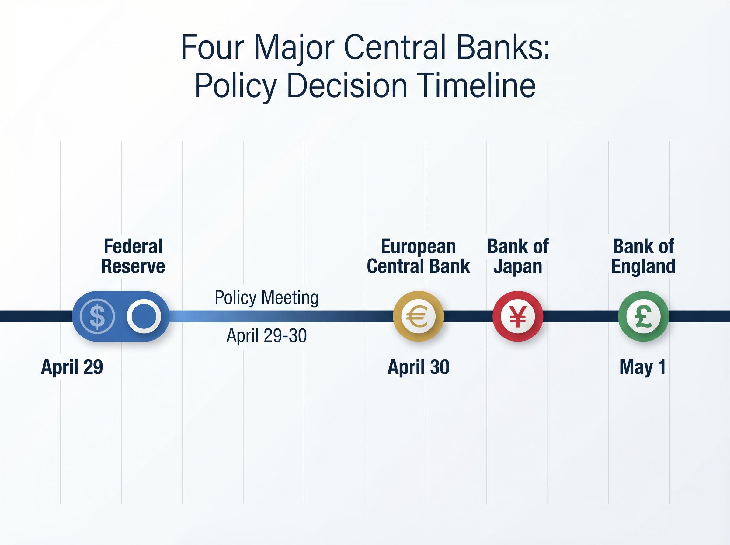 • Four major central banks, the Federal Reserve, European Central Bank, Bank of England, and Bank of Japan, are all announcing policy decisions within days of each other in late April and early May 2026, creating amplified market sensitivity.