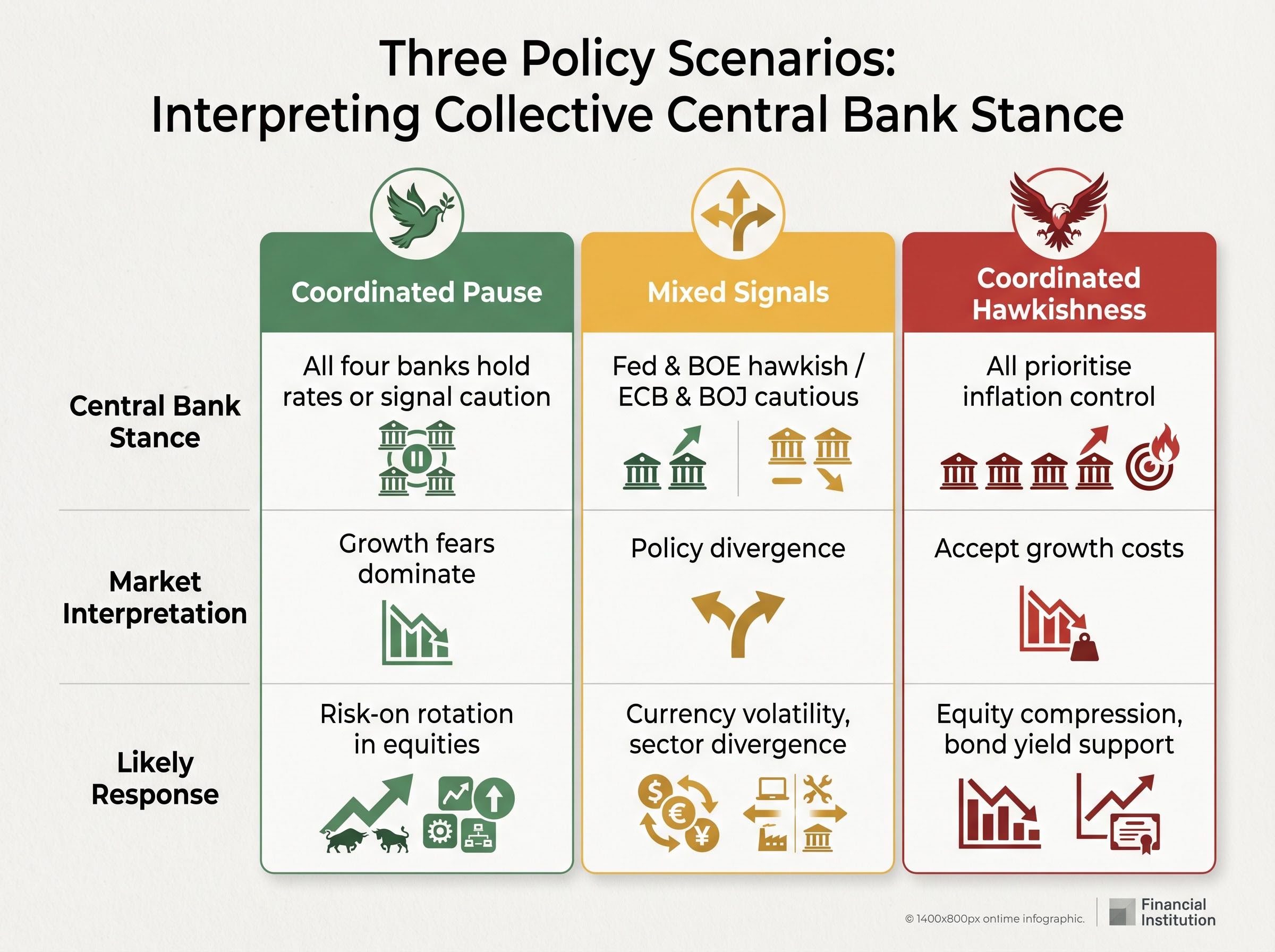 If all four major central banks hold rates steady or signal caution simultaneously, it would validate that growth fears are dominating policy thinking, which typically sparks risk-on rotation into equities and compresses bond yields. Investors should monitor the collective language around growth risks rather than parsing each individual rate decision in isolation.