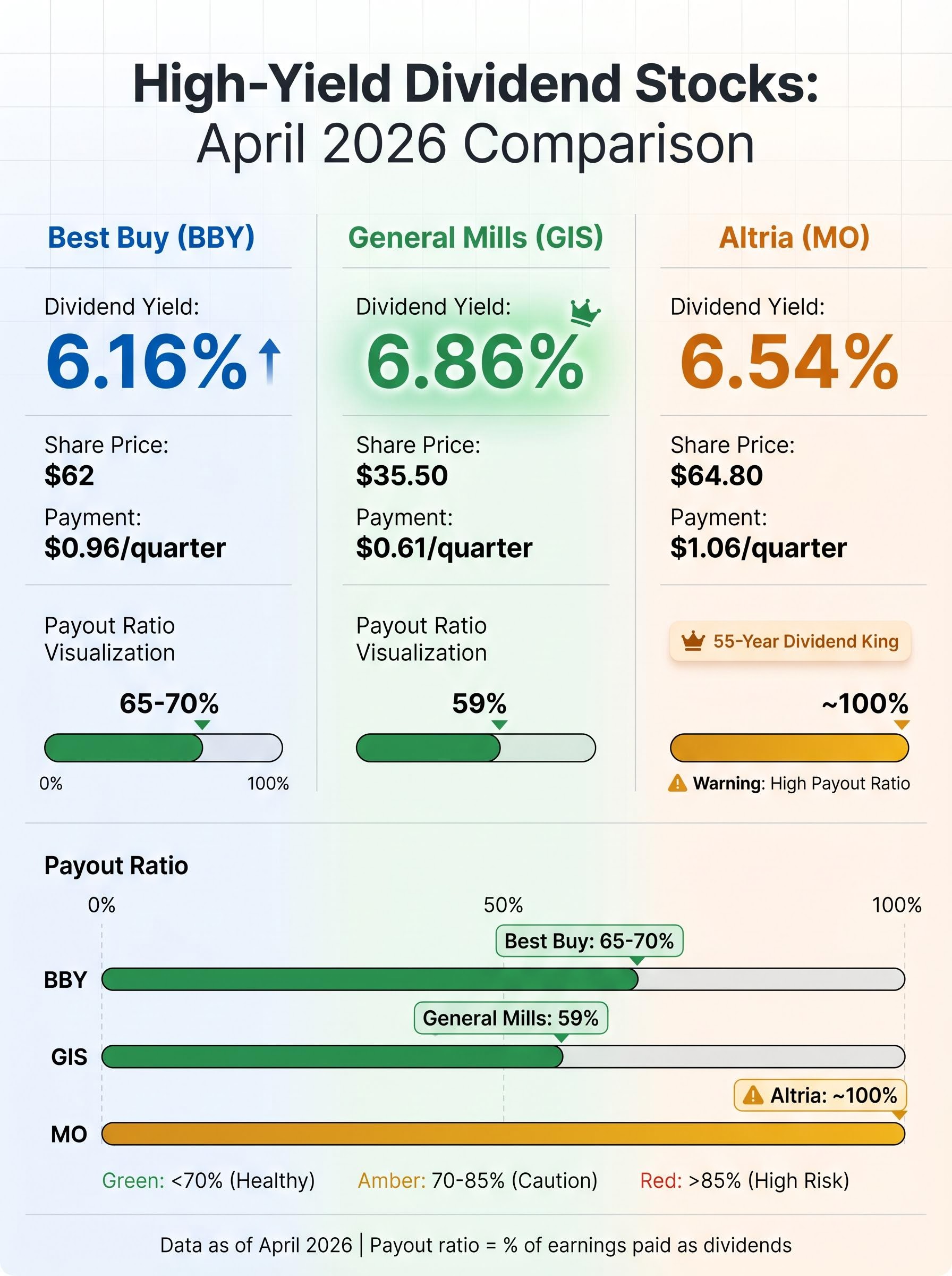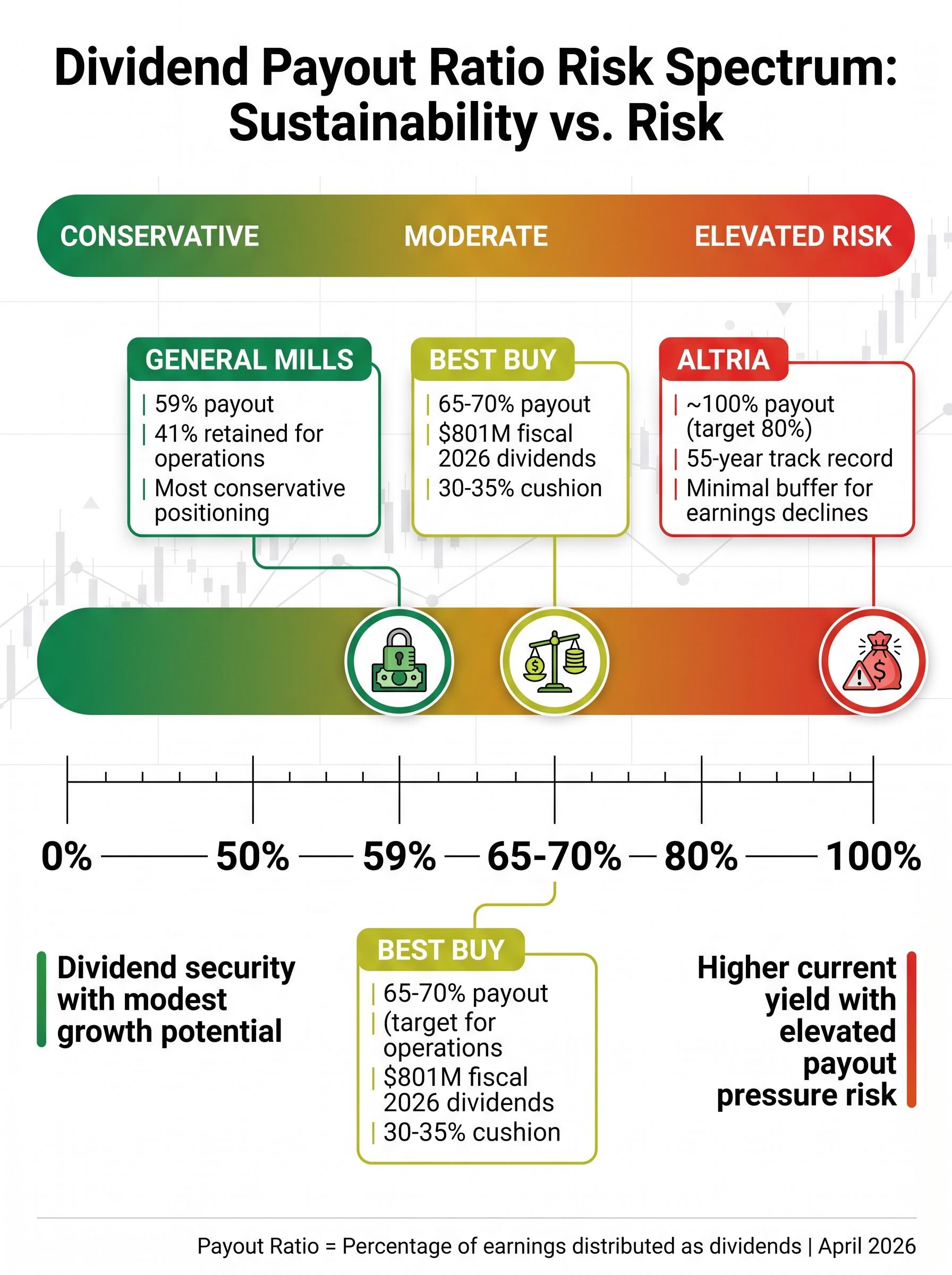 The payout ratio spectrum from 59% to 100% reflects different investor value propositions: General Mills and Best Buy offer dividend security with modest growth potential, while Altria delivers higher current yield with elevated risk that the payout may face pressure if earnings decline.