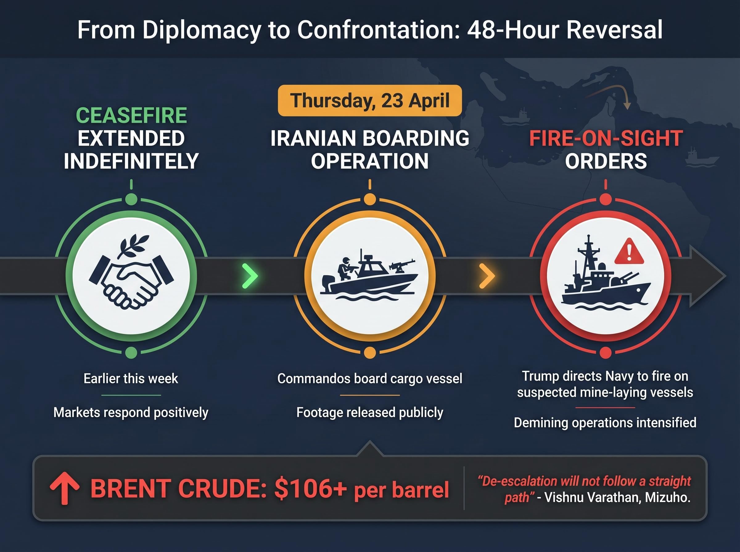 - Brent crude surged past $106 per barrel on 24 April 2026 after Iranian commandos boarded a cargo vessel and President Trump ordered the U.S. Navy to fire on suspected mine-laying Iranian ships in the Strait of Hormuz.