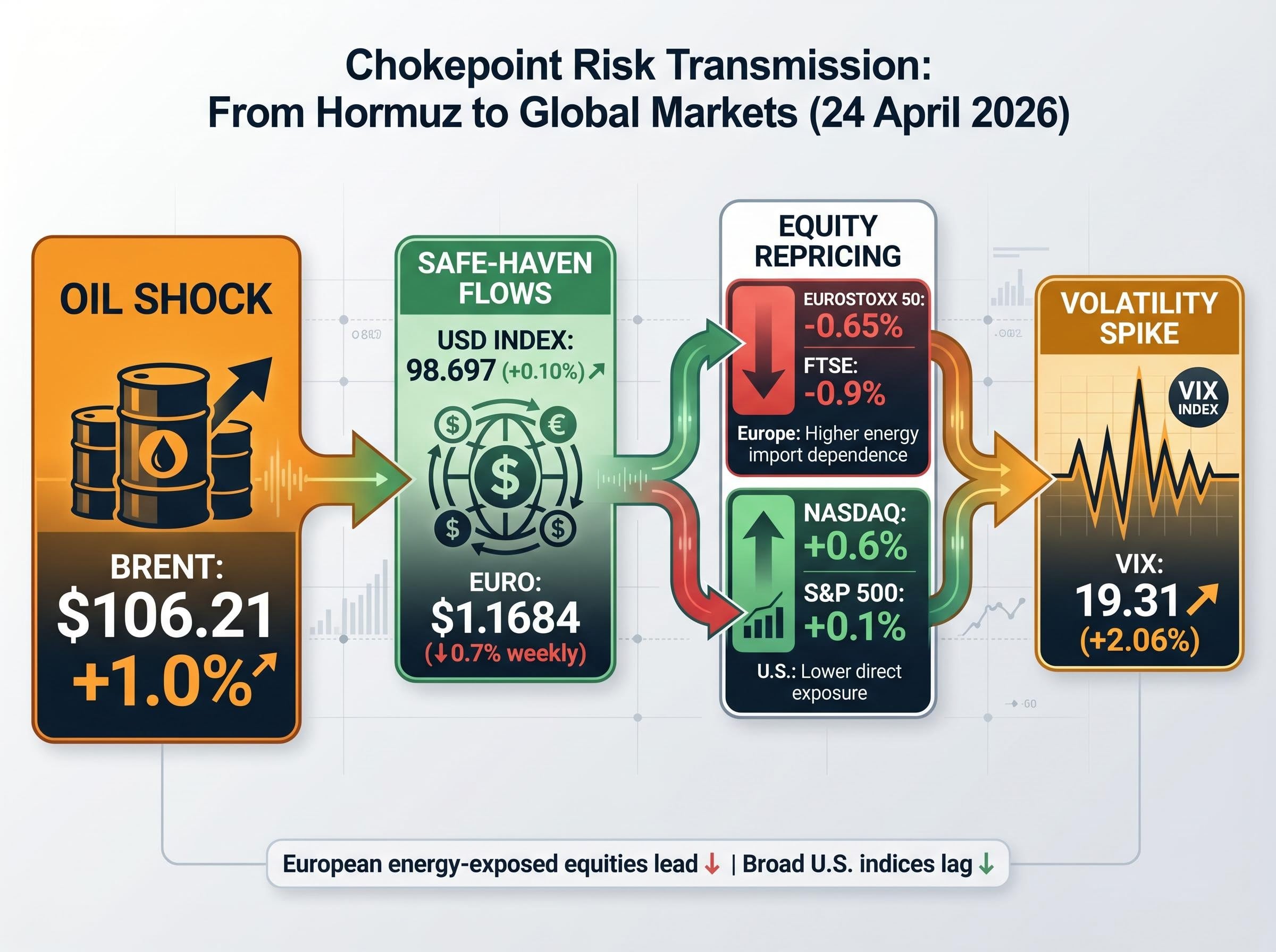 European futures fell harder than U.S. futures on 24 April. EUROSTOXX 50 futures dropped 0.65% while FTSE futures fell 0.9%. The gap reflects Europe’s greater energy import dependence. When Brent moves, European equity markets absorb the repricing faster than their U.S. counterparts.