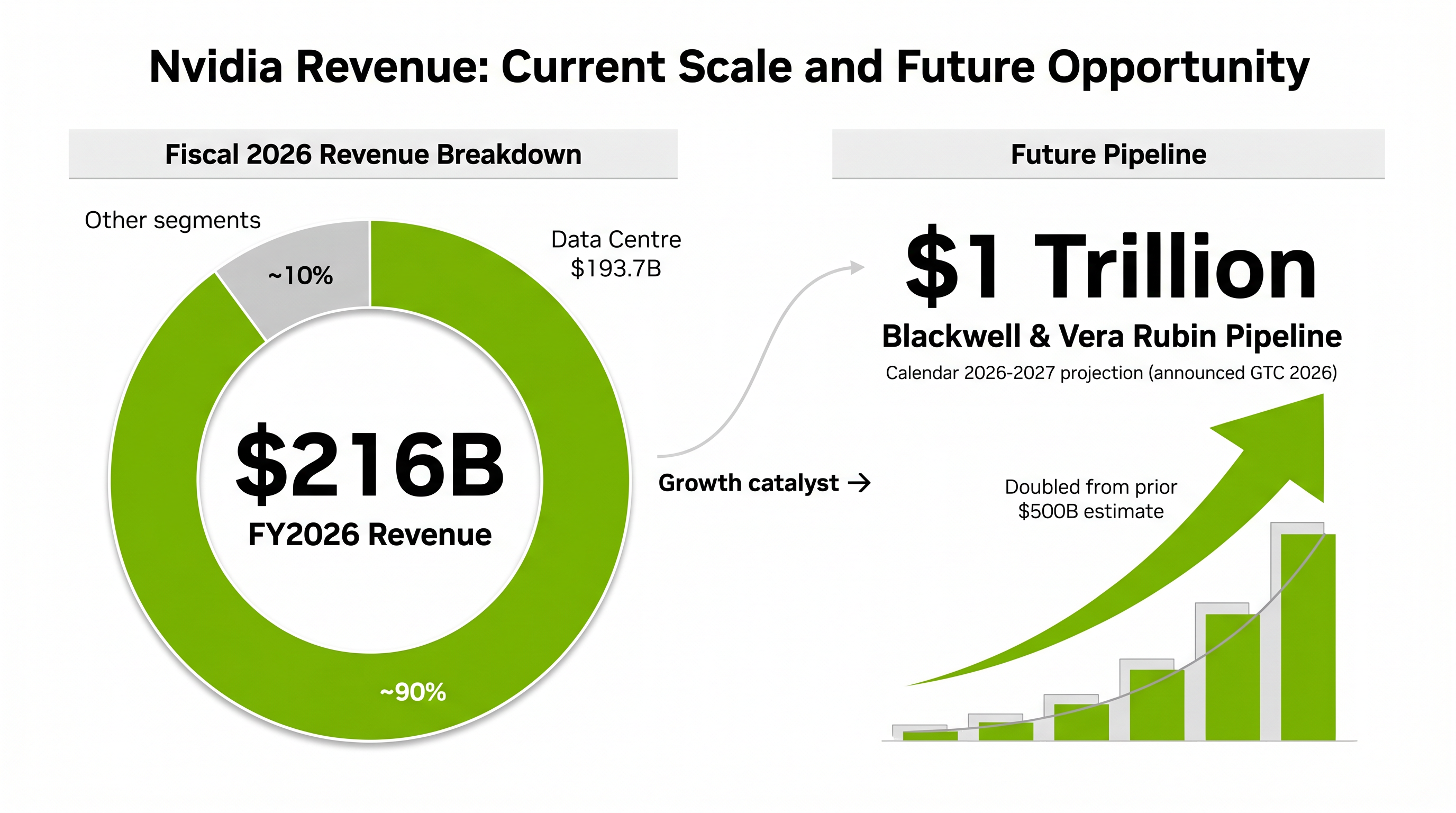 At GTC 2026 in March, Nvidia projected a $1 trillion revenue opportunity from its Blackwell and Vera Rubin product families over calendar years 2026 and 2027. The projection doubled a prior estimate of $500 billion, signalling accelerating demand. If achieved, the pipeline would represent a step-change in scale that would justify or exceed current analyst targets.