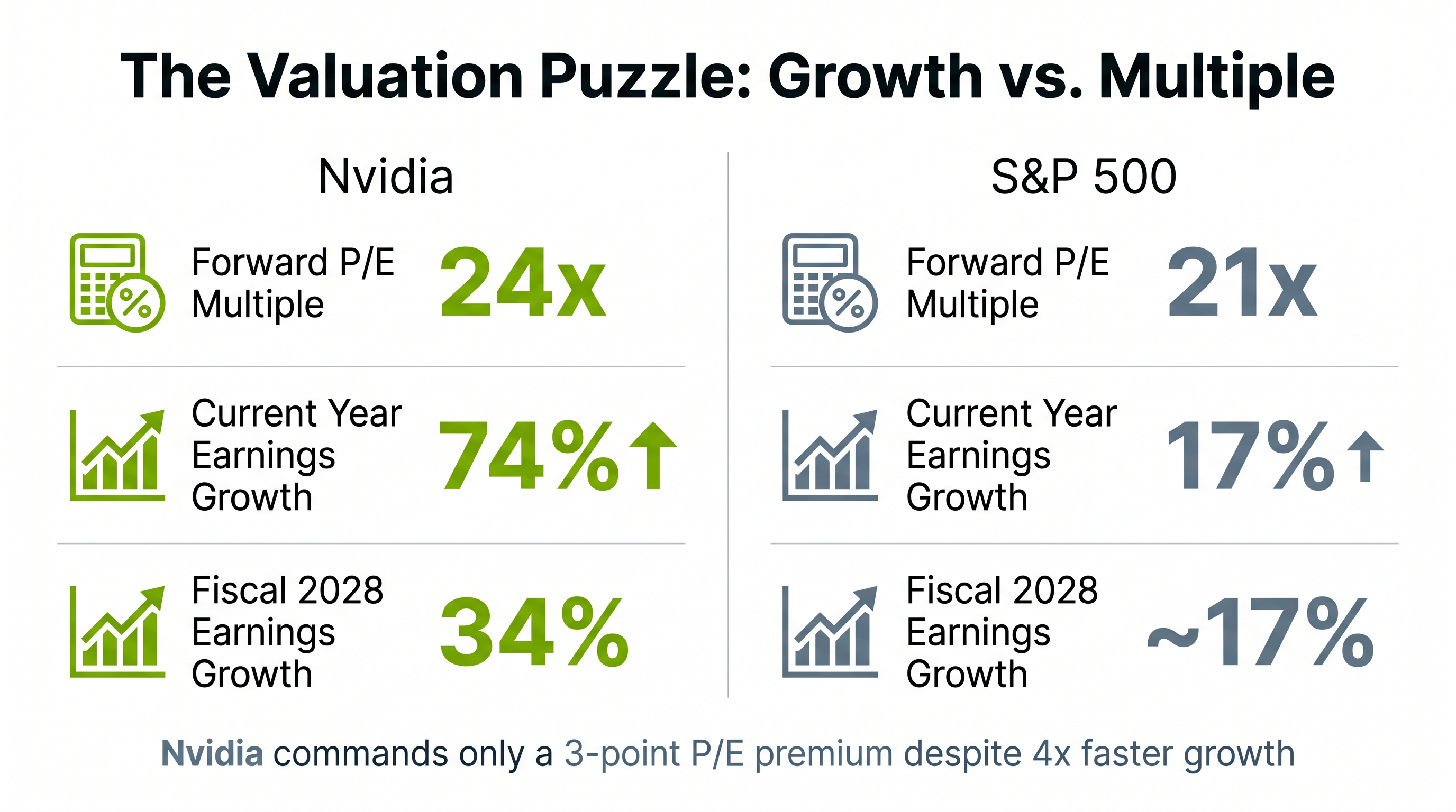 The gap presents two interpretations. Bulls argue Nvidia is undervalued relative to its growth trajectory. A company compounding earnings at 34% through fiscal 2028 should command a materially higher multiple than an index growing at half that rate. Bears counter that the narrow premium reflects justified scepticism about whether Nvidia can sustain its dominance as competition from AMD, Intel, and hyperscaler custom chips intensifies.