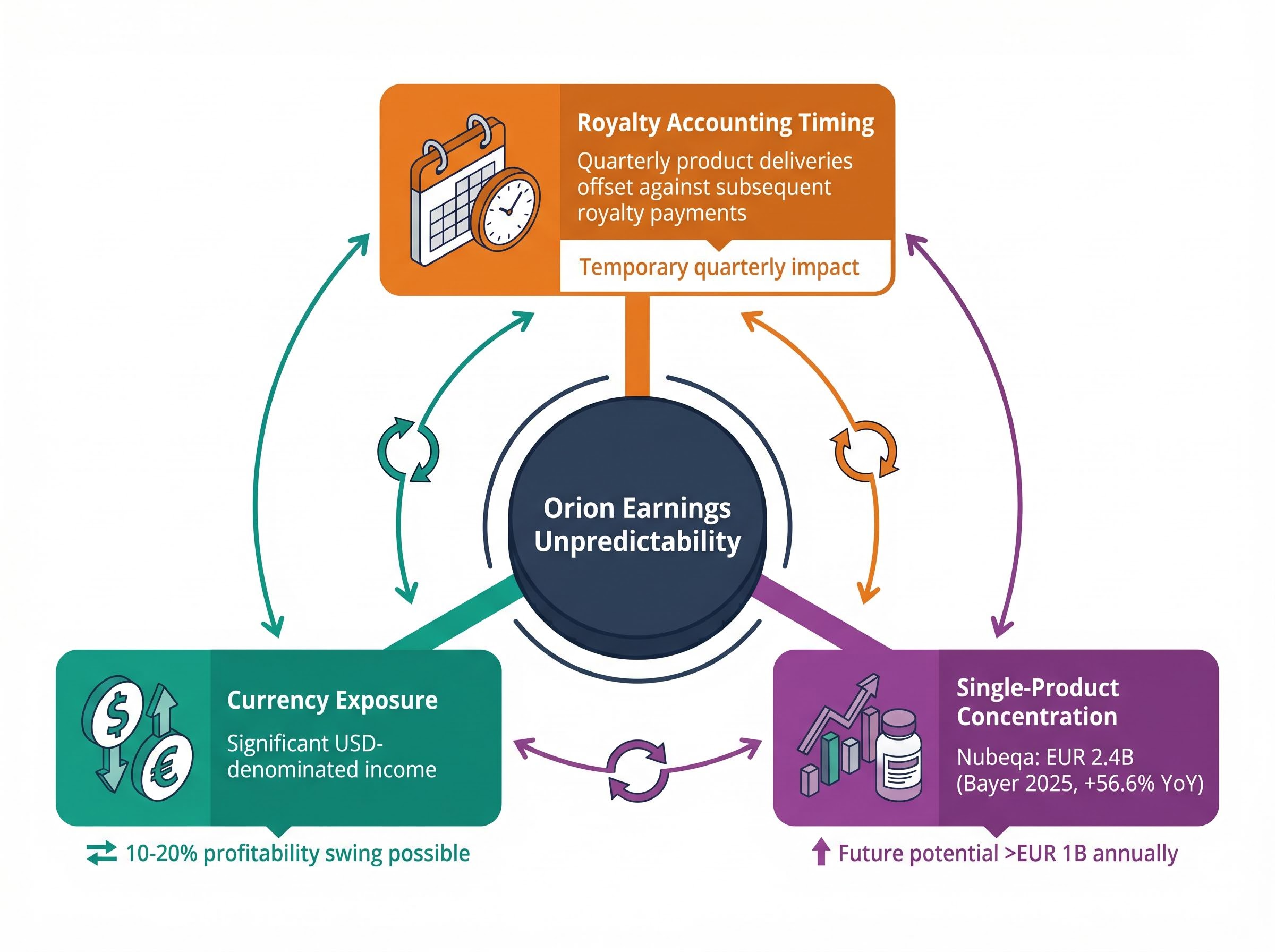 Orion receives a percentage of Bayer’s global Nubeqa sales as royalty income. The specific percentage remains undisclosed, but the mechanism creates structural volatility in reported earnings independent of underlying business performance.