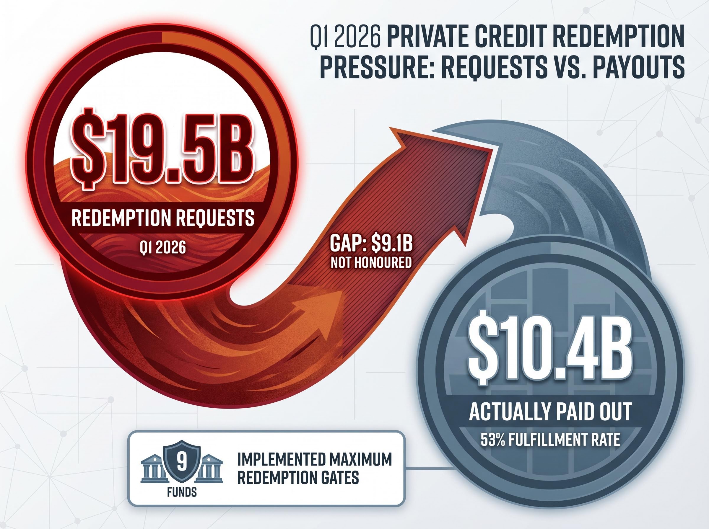 - Q1 2026 redemption requests across 17 major private credit funds totalled $19.5 billion, with only 53% honoured as nine funds implemented maximum redemption gates, signalling broad investor concern about current valuations.