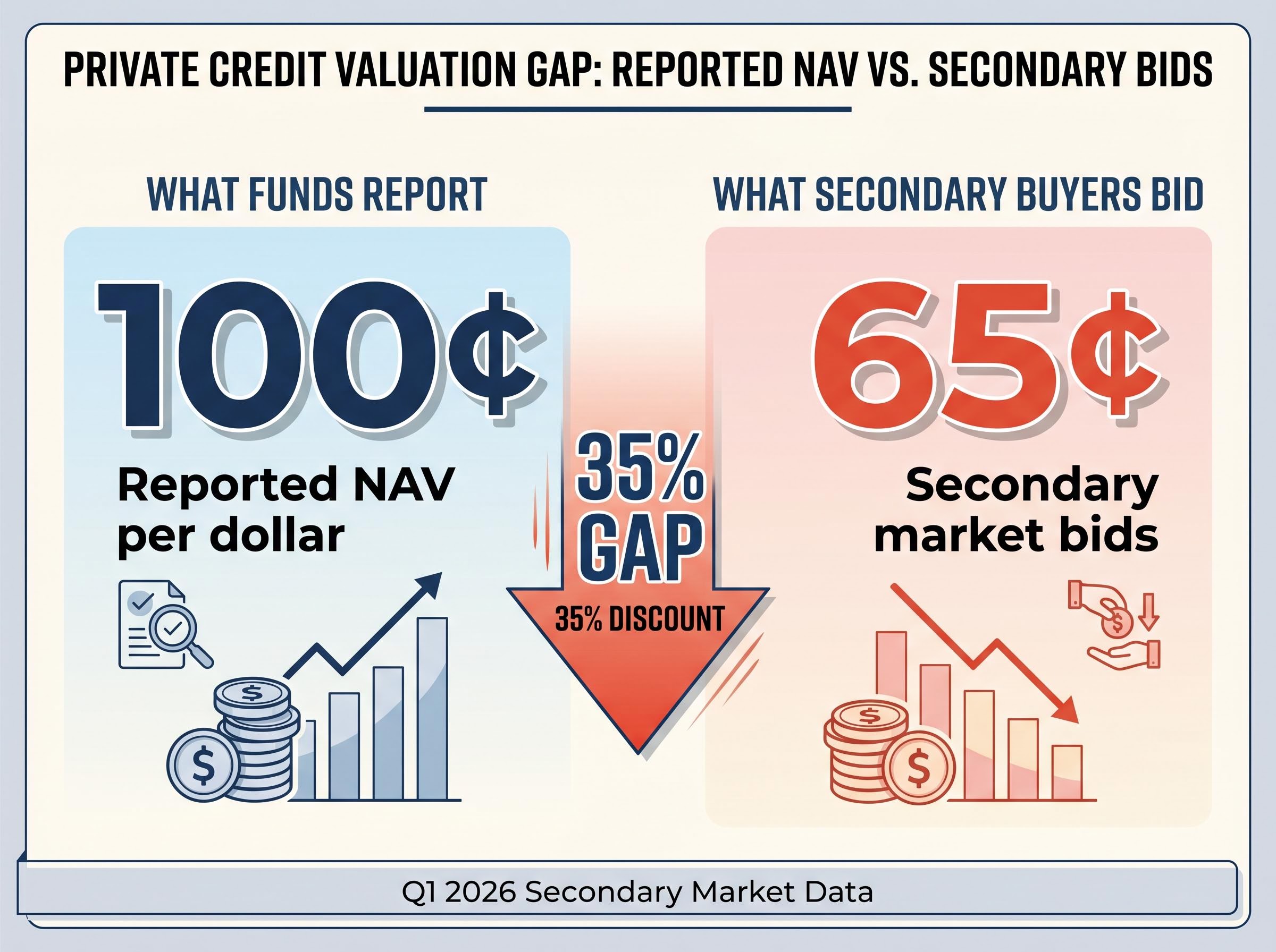 Secondary market buyers are bidding 65 cents on the dollar for private credit fund stakes whilst managers continue reporting those same assets at full net asset value. This 35% gap between what investors will pay and what funds claim their holdings are worth has become the central question of 2026 for a sector managing $644 billion in assets.