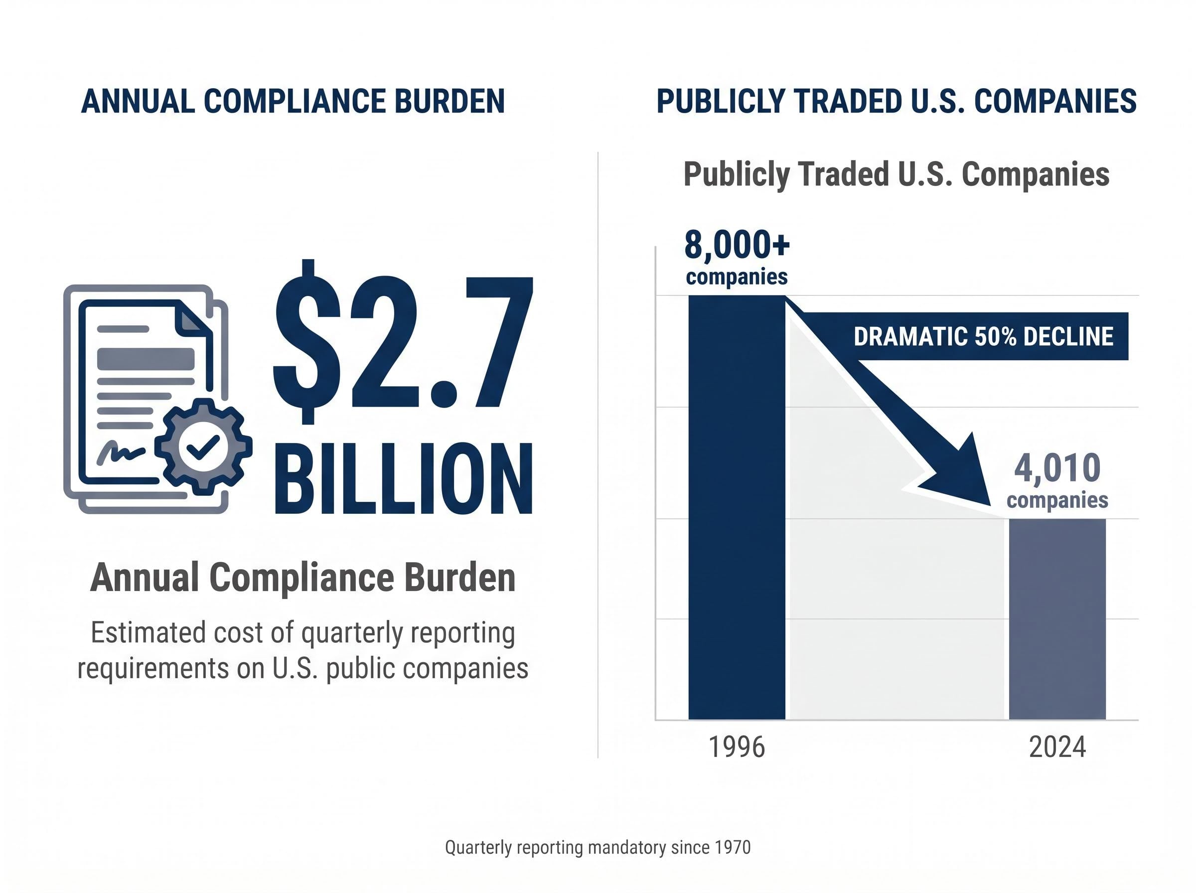 The compliance burden argument rests on specific cost estimates. The SEC has cited a $2.7 billion annual compliance burden that quarterly reporting requirements currently place on public firms.