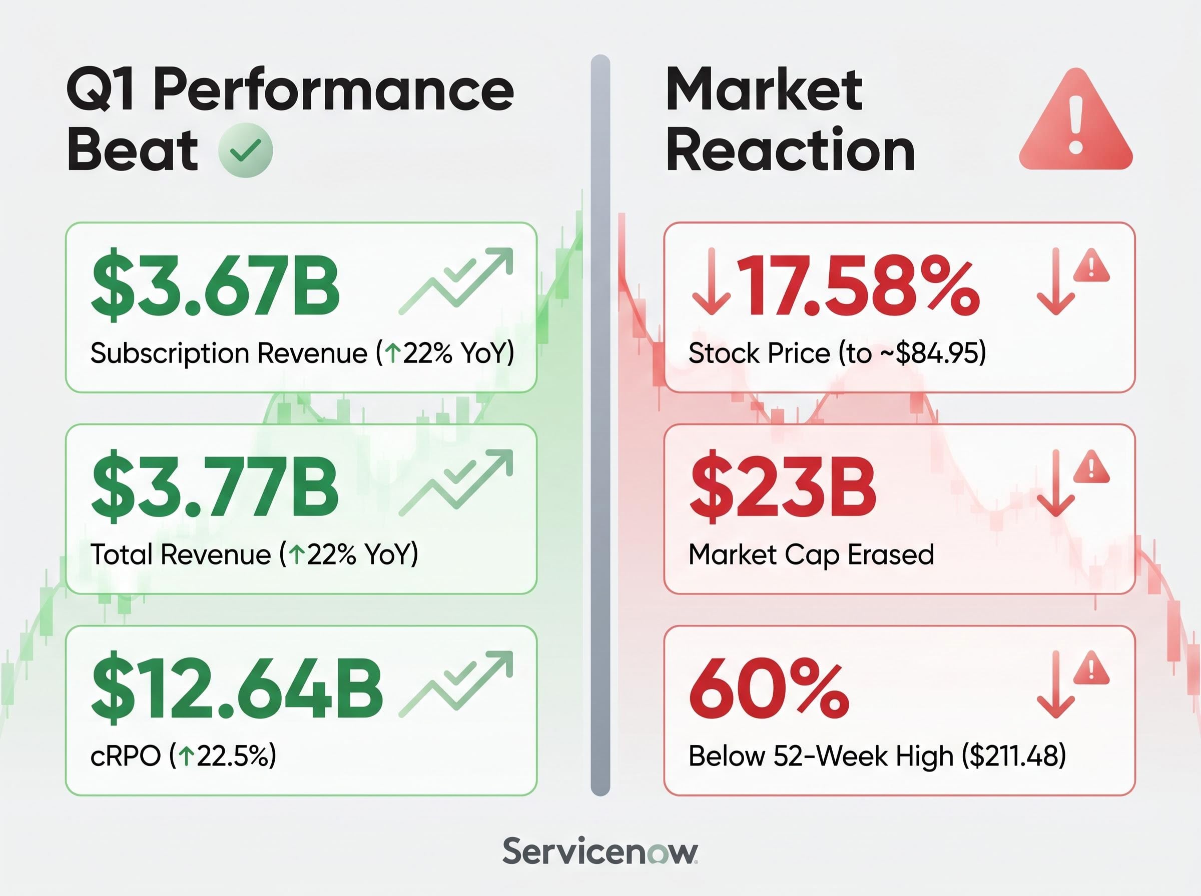 ServiceNow shares plunged 17% on Wednesday despite the enterprise software giant posting 22% subscription revenue growth that topped its own guidance ceiling. The disconnect between strong Q1 numbers and market punishment reflects investor anxiety about decelerating forward growth and margin pressure from the company’s $8 billion Armis acquisition. For investors tracking enterprise software and AI adoption trends, the results offer a case study in how even beat-and-raise quarters can disappoint when valuations leave no room for imperfection. This article breaks down what ServiceNow actually reported, why the stock sold off anyway, and what the results signal about the AI pricing transition reshaping enterprise software.