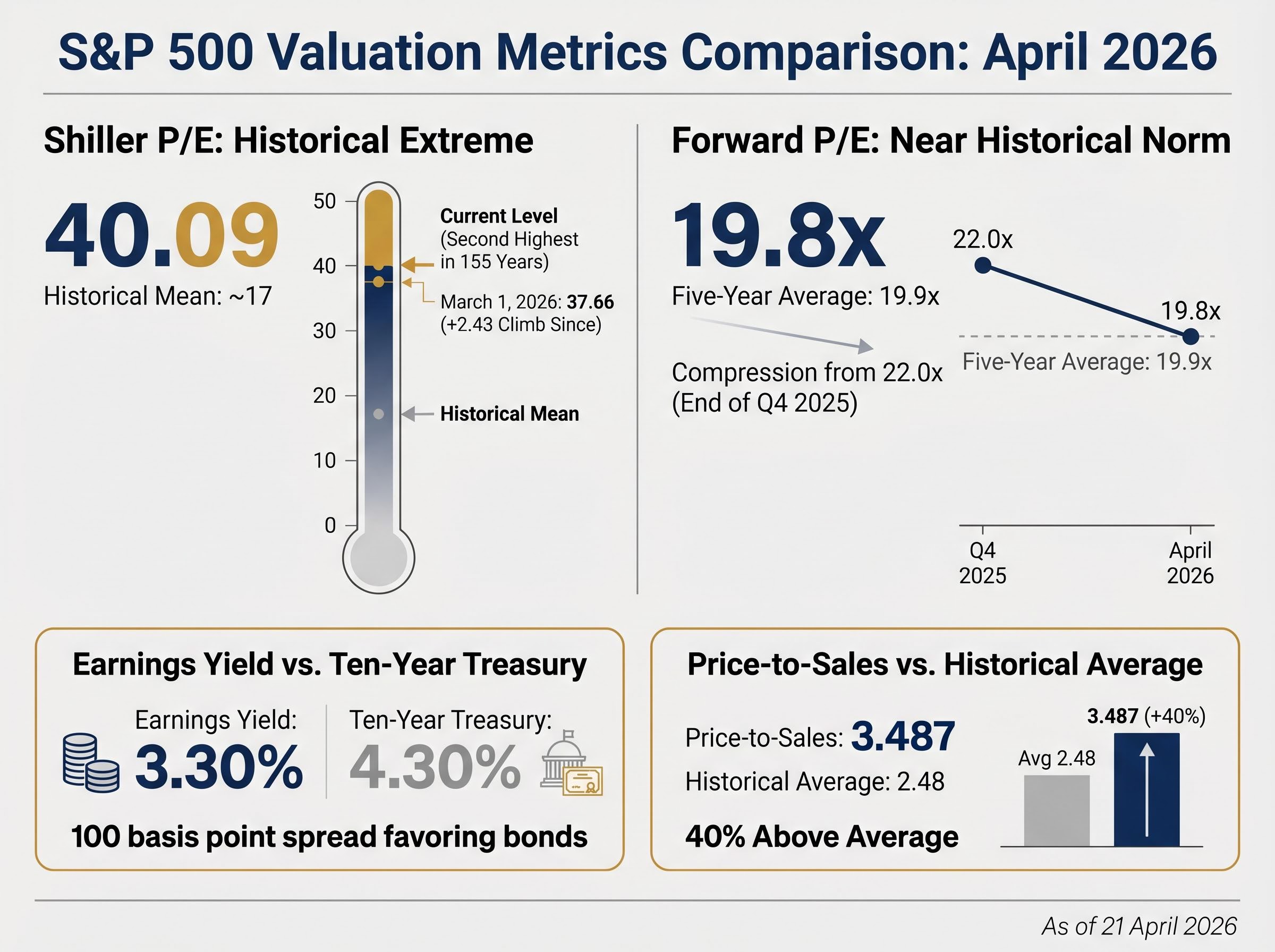 - The S&P 500 Shiller P/E reached 40.09 in April 2026, the second-highest reading in 155 years, while the forward P/E compressed to 19.8 times, near its five-year average, creating a split valuation signal for investors.