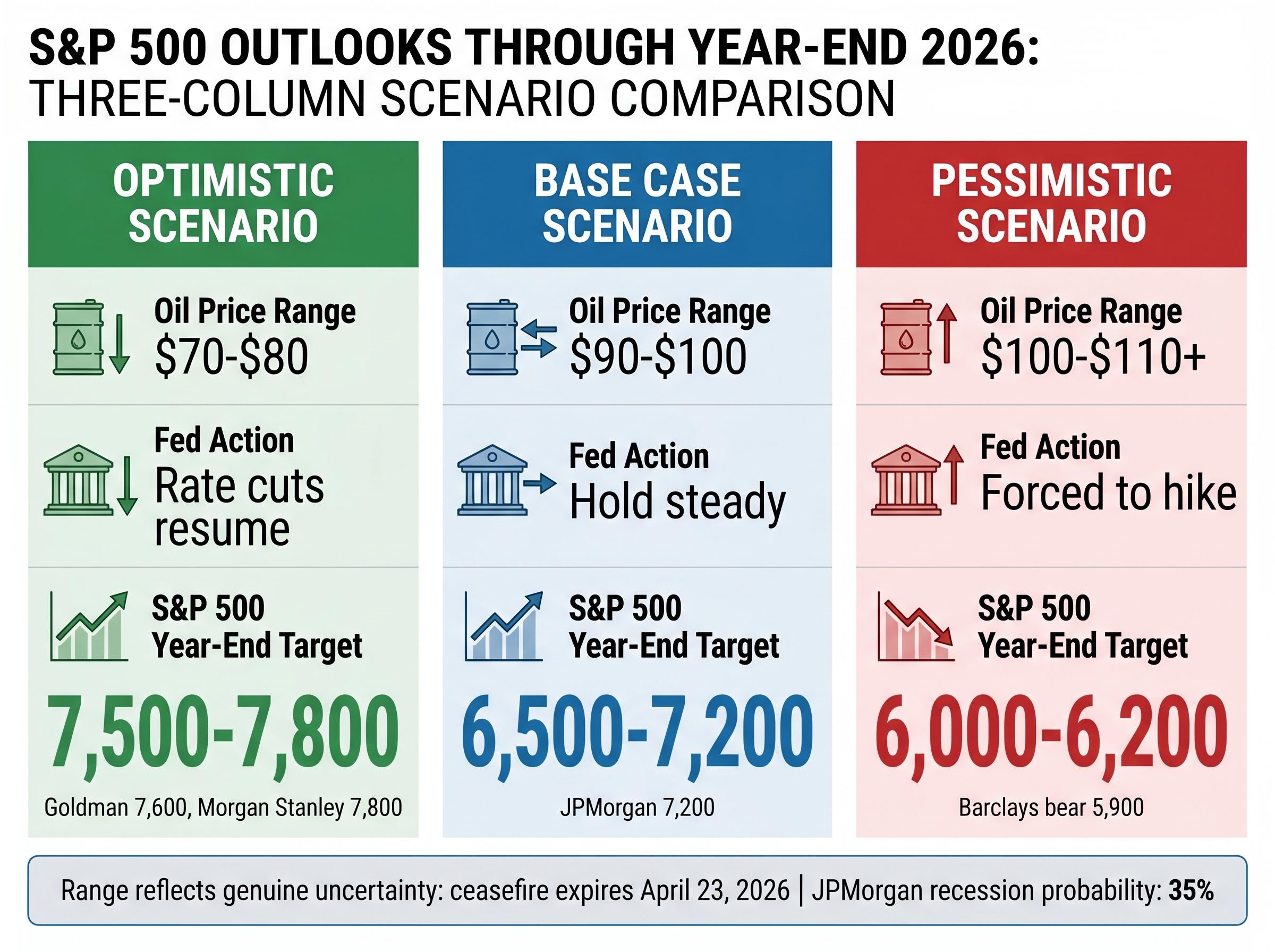 The pessimistic scenario involves geopolitical escalation, crude oil prices remaining elevated above $100-110 per barrel, persistent inflation that forces the Federal Reserve toward rate hikes, substantial corporate earnings disappointments as input costs compress margins, and broad repricing that carries the S&P 500 toward 6,000-6,200. JPMorgan forecasts a 35 per cent recession probability in 2026. Barclays outlined a bear case of 5,900.
