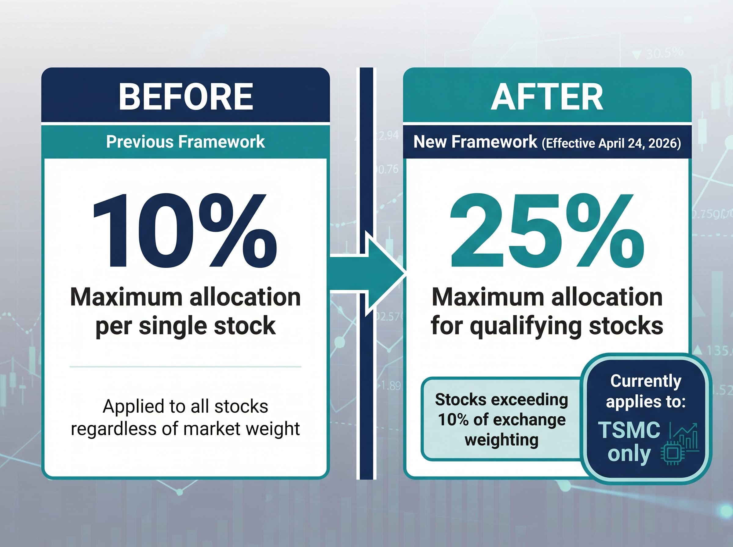 The new framework allows funds to allocate up to 25% to stocks that exceed 10% of exchange weighting. TSMC is the sole current beneficiary of this threshold.