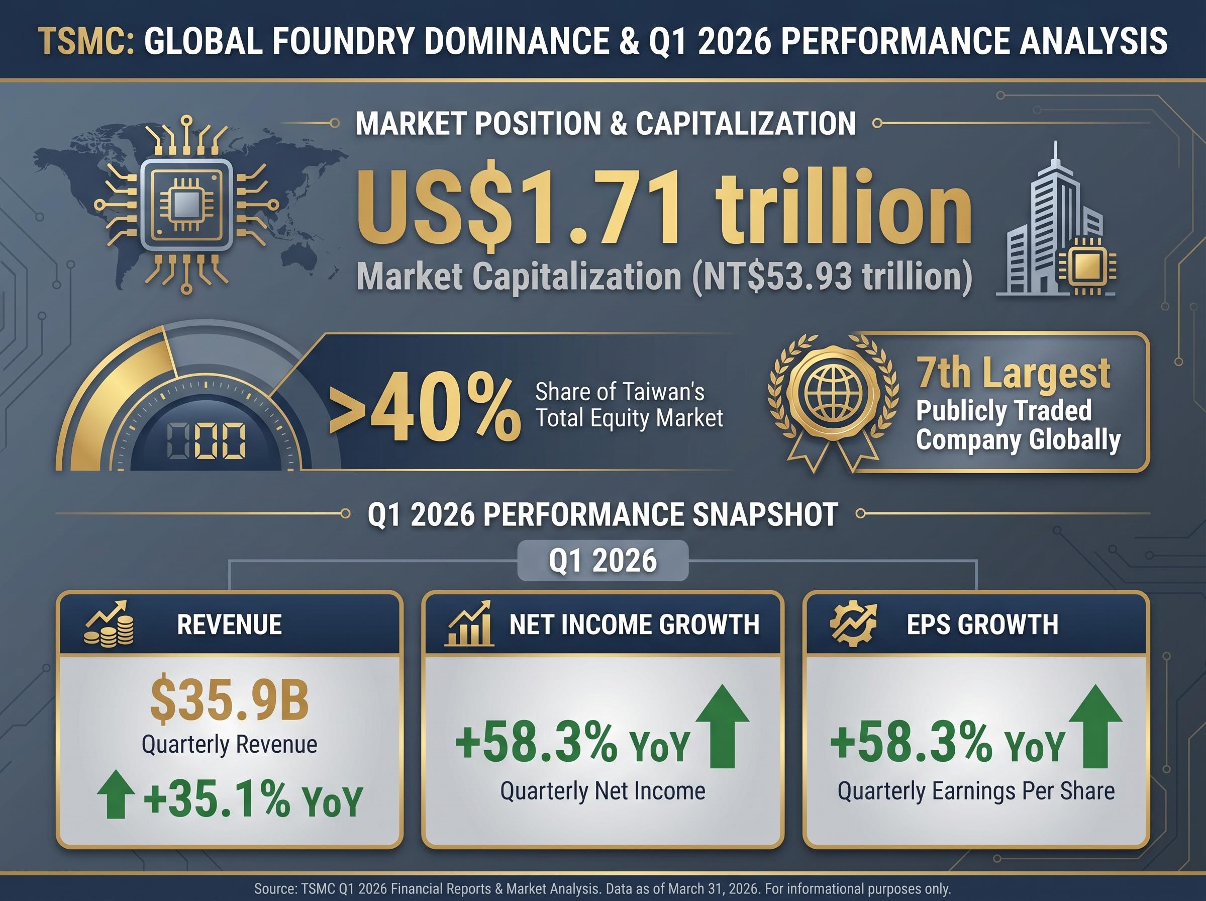 - TSMC reported Q1 2026 revenue of $35.9 billion, representing 35.1% year-over-year growth, with net income and earnings per share both rising 58.3% and gross margin reaching 66.2%.