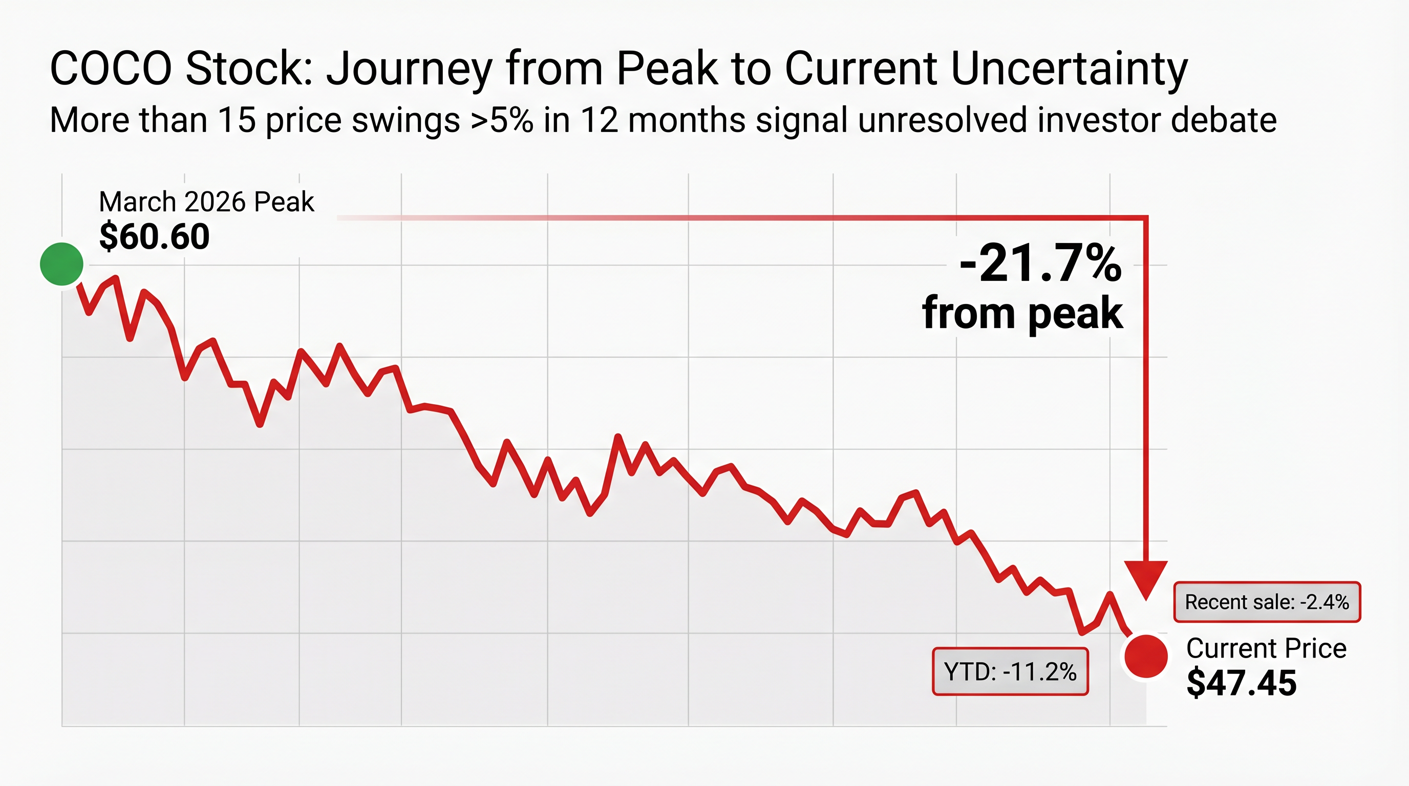 The sustained selling pressure and elevated volatility in COCO shares align with broader market uncertainty in 2026, making strategies for managing portfolio volatility in 2026 particularly relevant for investors navigating both macro headwinds and company-specific execution risks.