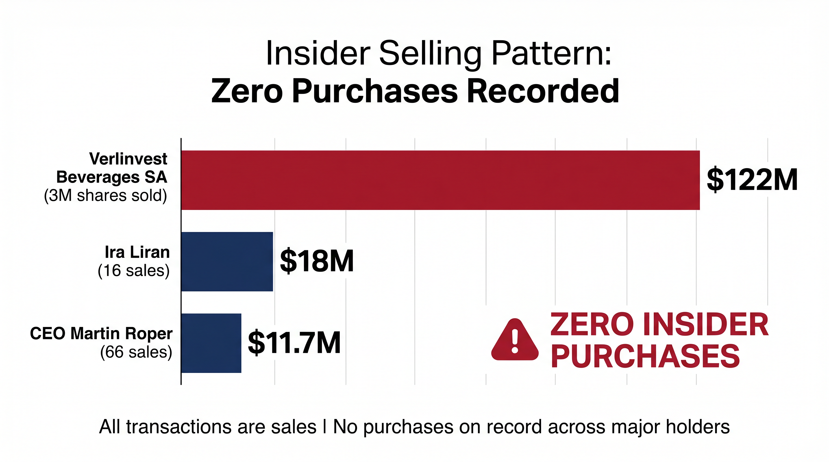 Pattern of One-Way Selling CEO Martin Roper: 66 sales, $11.7M total | Ira Liran: 16 sales, $18M total | Verlinvest Beverages SA: 3M shares sold for $122M | Zero insider purchases on record