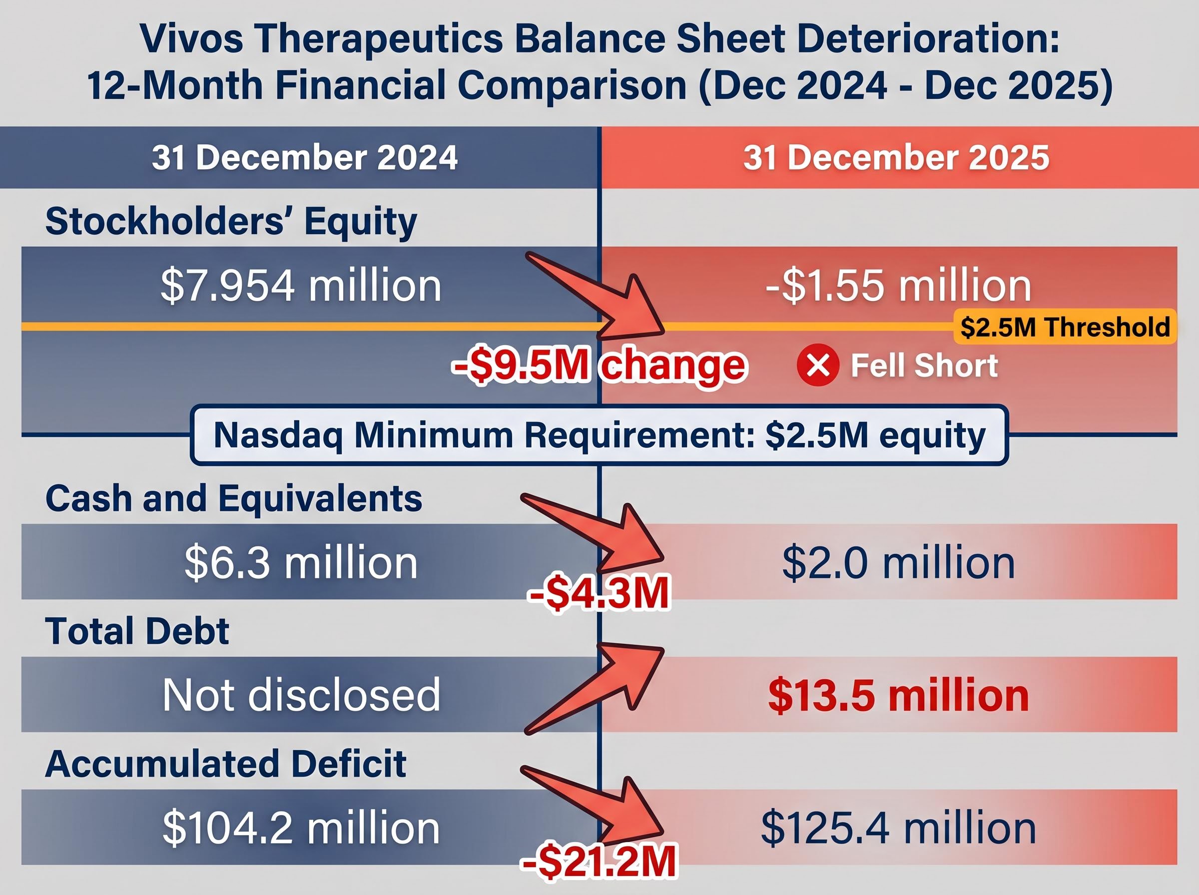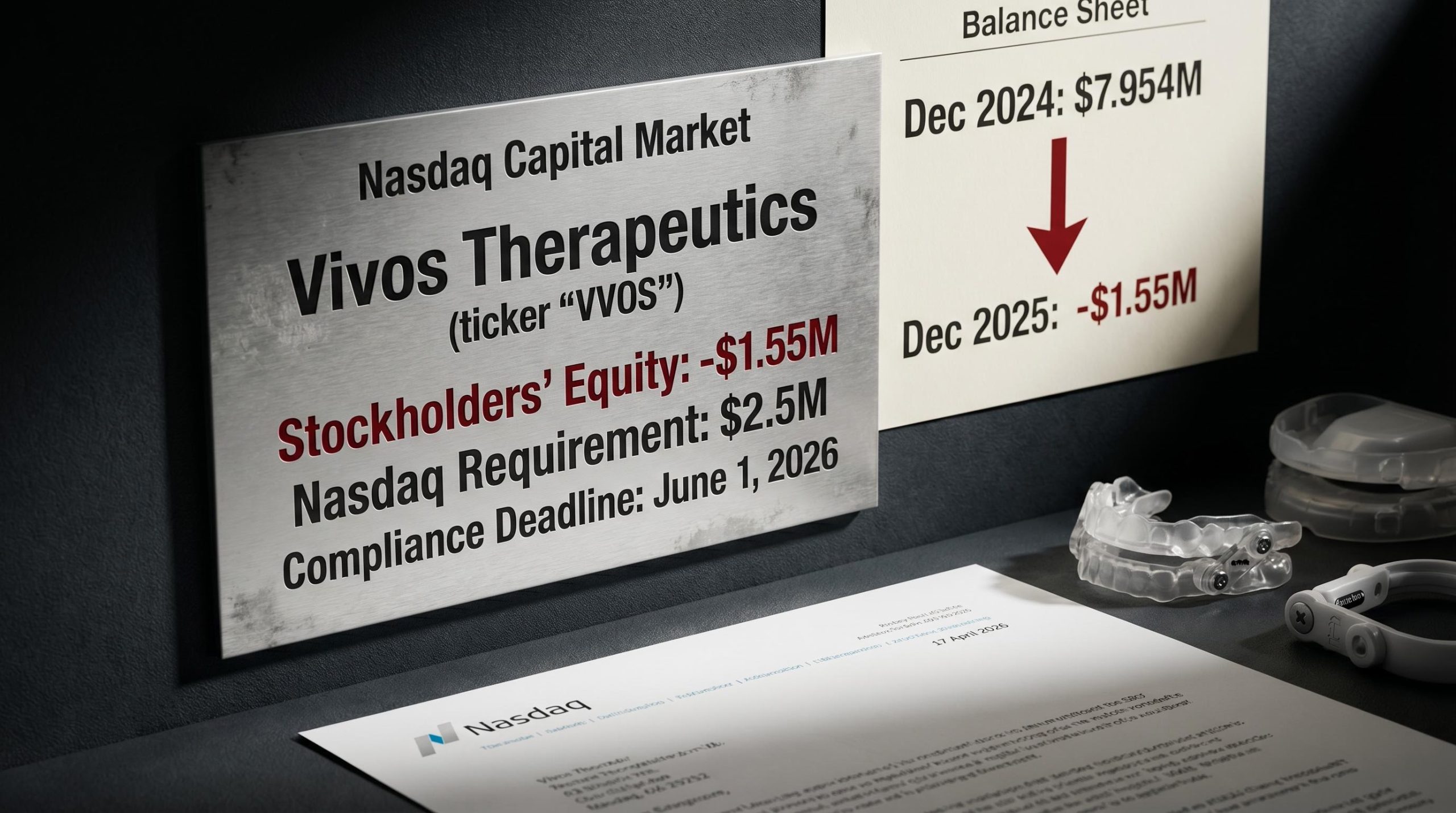 - Vivos Therapeutics received a Nasdaq deficiency notice on 17 April 2026 after reporting negative stockholders equity of approximately $1.55 million, falling short of the exchange's $2.5 million minimum requirement.