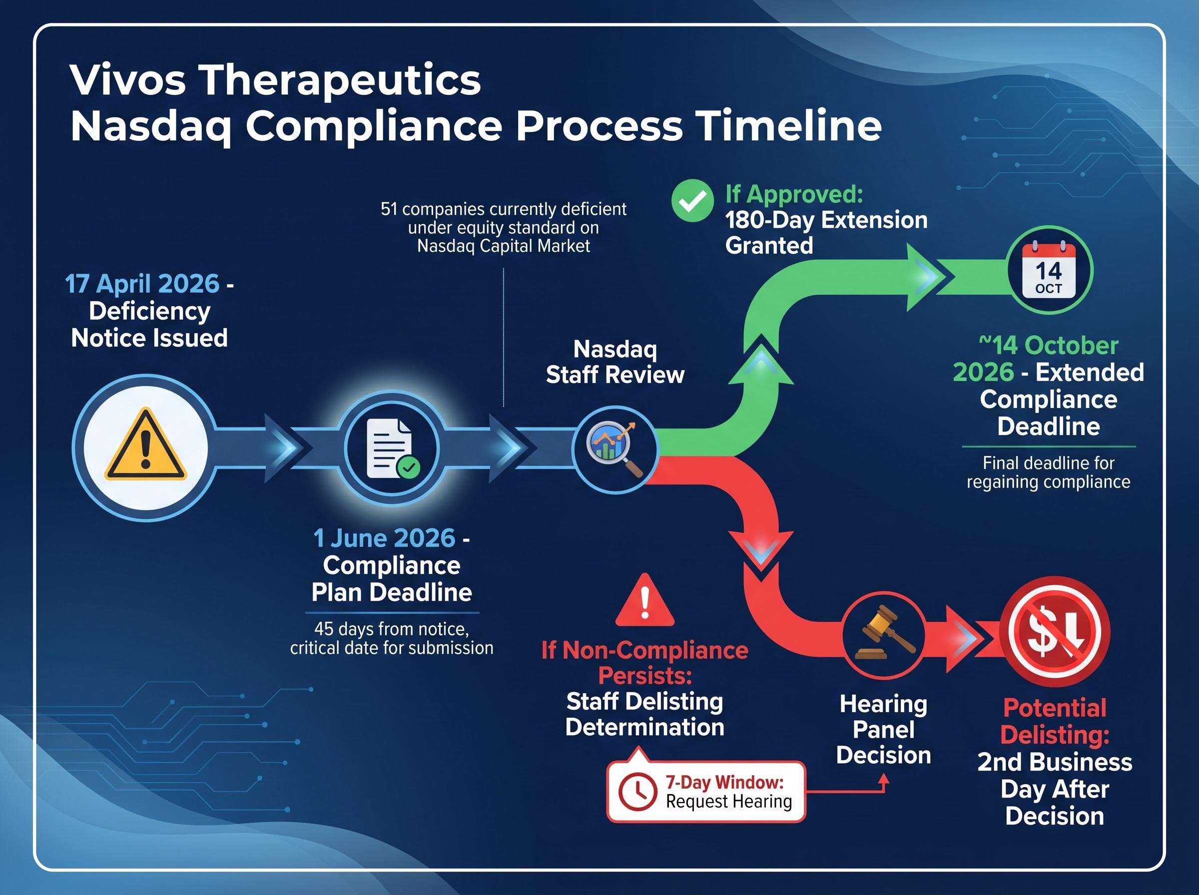 Vivos has until 1 June 2026 to submit a detailed compliance plan demonstrating a credible pathway back to positive equity and sustained compliance. If Nasdaq’s Listing Qualifications Staff accepts the plan, the company may receive an extension of up to 180 calendar days from the notice date, extending the compliance deadline through approximately 14 October 2026.