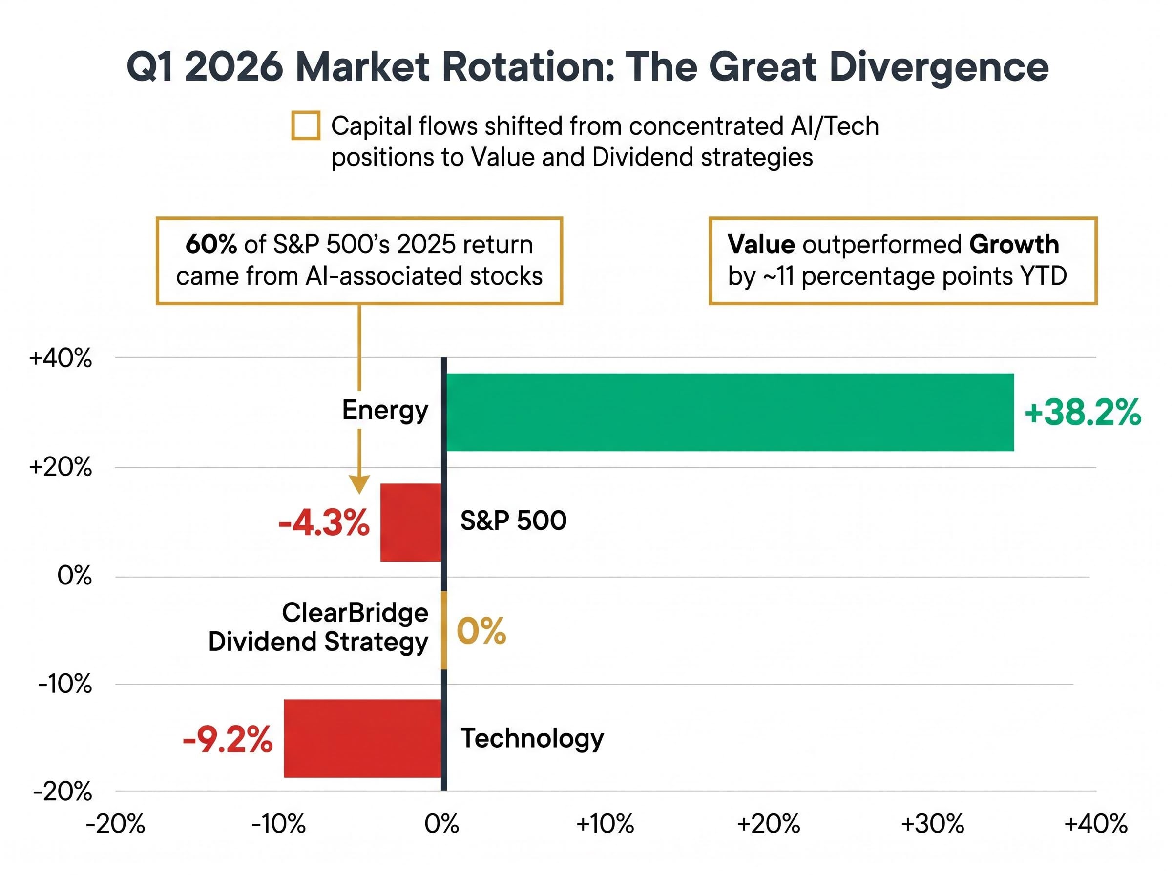 Approximately 60% of the S&P 500’s 2025 return came from AI-associated stocks. That concentration created risk that prompted investor reallocation starting in late 2025 and accelerating through the first quarter of 2026.