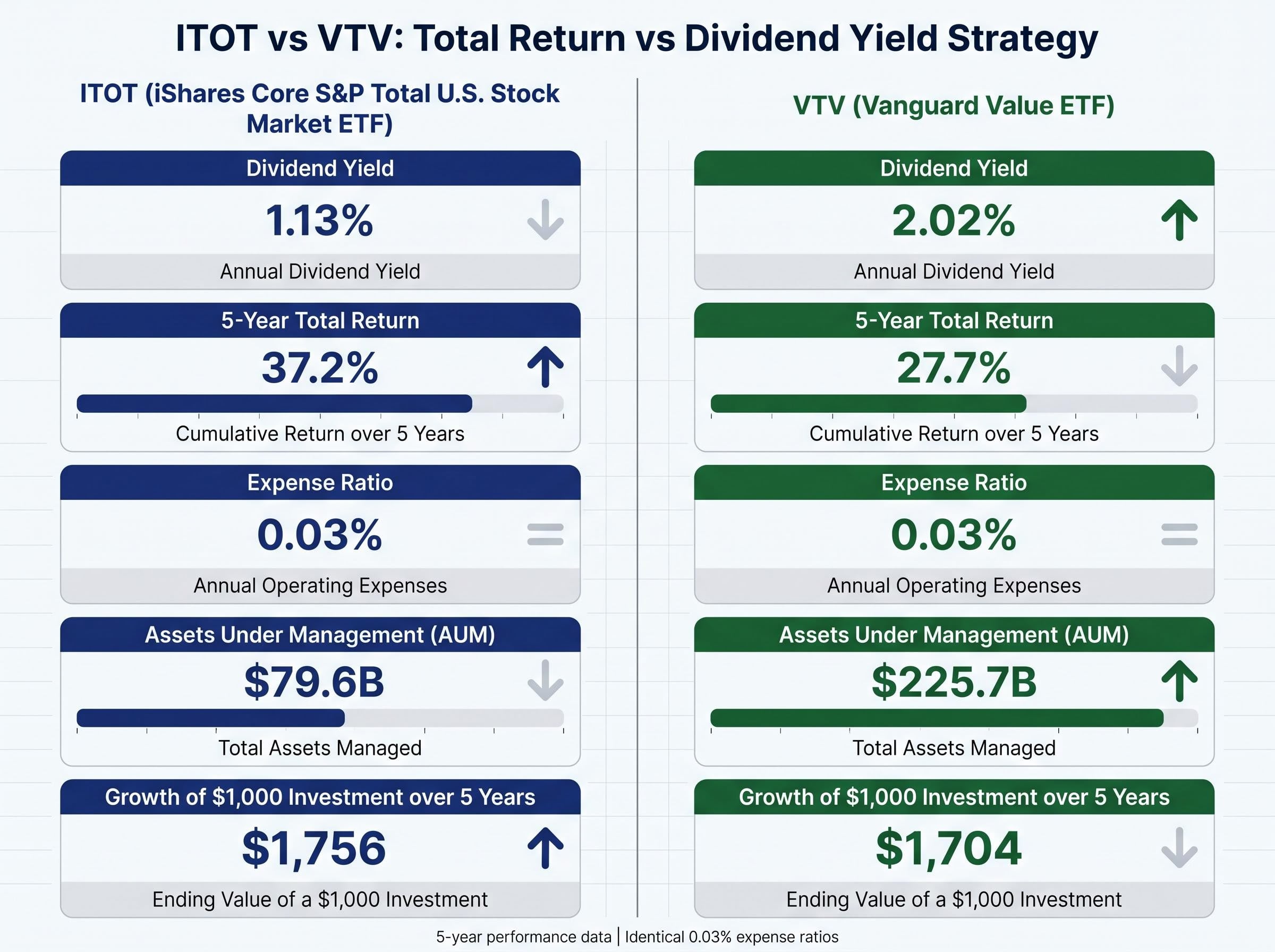 - A $1,000 investment in ITOT grew to $1,756 over five years while VTV reached $1,704, but VTV's 2.02% dividend yield nearly doubles ITOT's 1.13%, illustrating the core trade-off between total return and income generation.