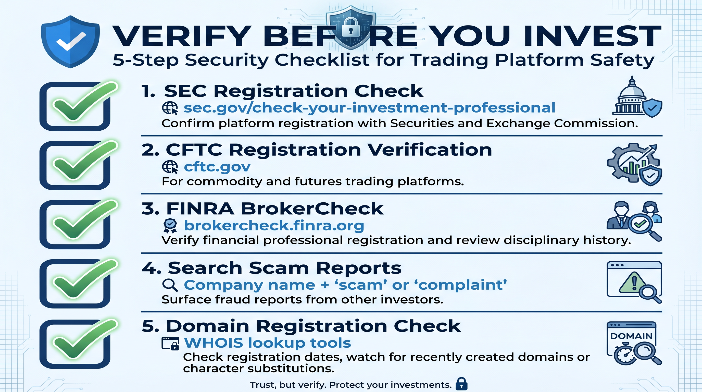 - Investors can verify any trading platform in minutes by checking SEC, CFTC, and FINRA registrations before funding an account, providing the most effective protection against sophisticated scams.