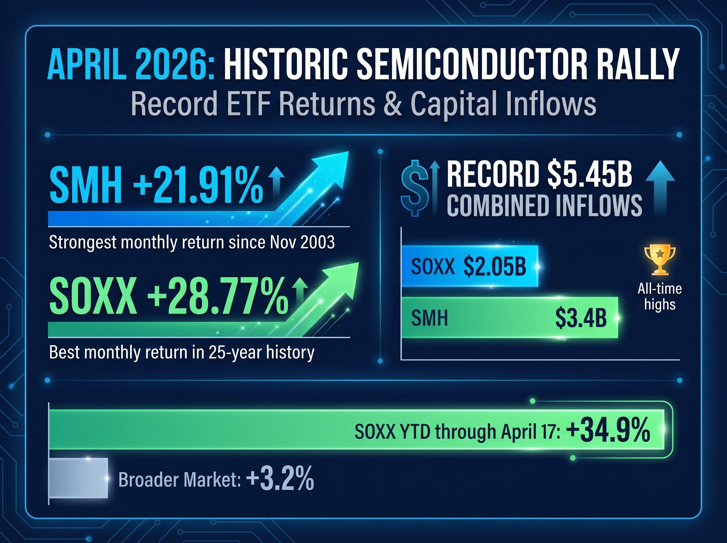 Capital flows amplified the magnitude of the move. SOXX absorbed $2.05 billion in April inflows alone, more than doubling its previous monthly record. SMH pulled in $3.4 billion, also an all-time high. The combined $5.45 billion in flows represents institutional capital concentration at a scale not previously observed in the semiconductor ETF category, suggesting large asset managers have increased sector exposure rather than merely rebalancing within existing allocations.