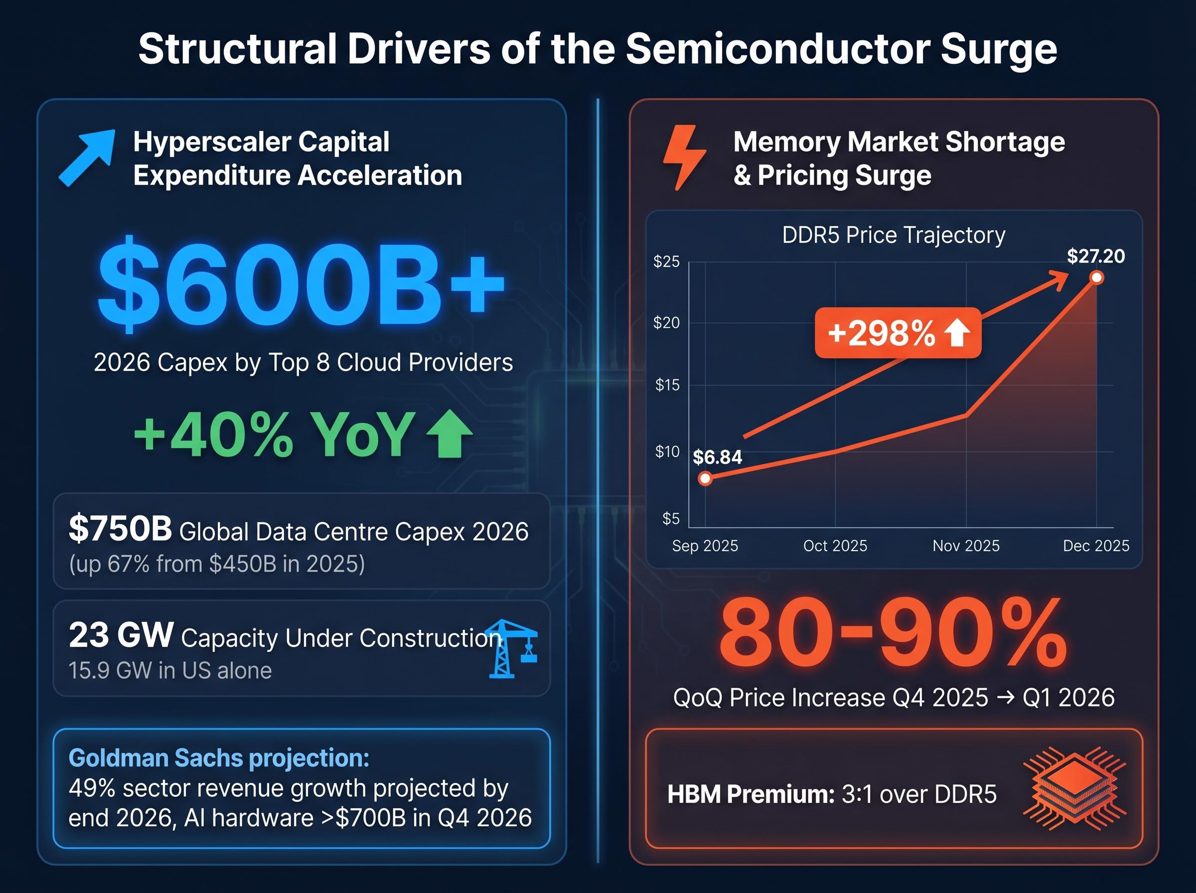 - Hyperscaler capital expenditure is projected to exceed $600 billion in 2026, up 40% year over year, with 23 gigawatts of data centre capacity under construction globally providing multi-quarter demand visibility for semiconductor suppliers.
