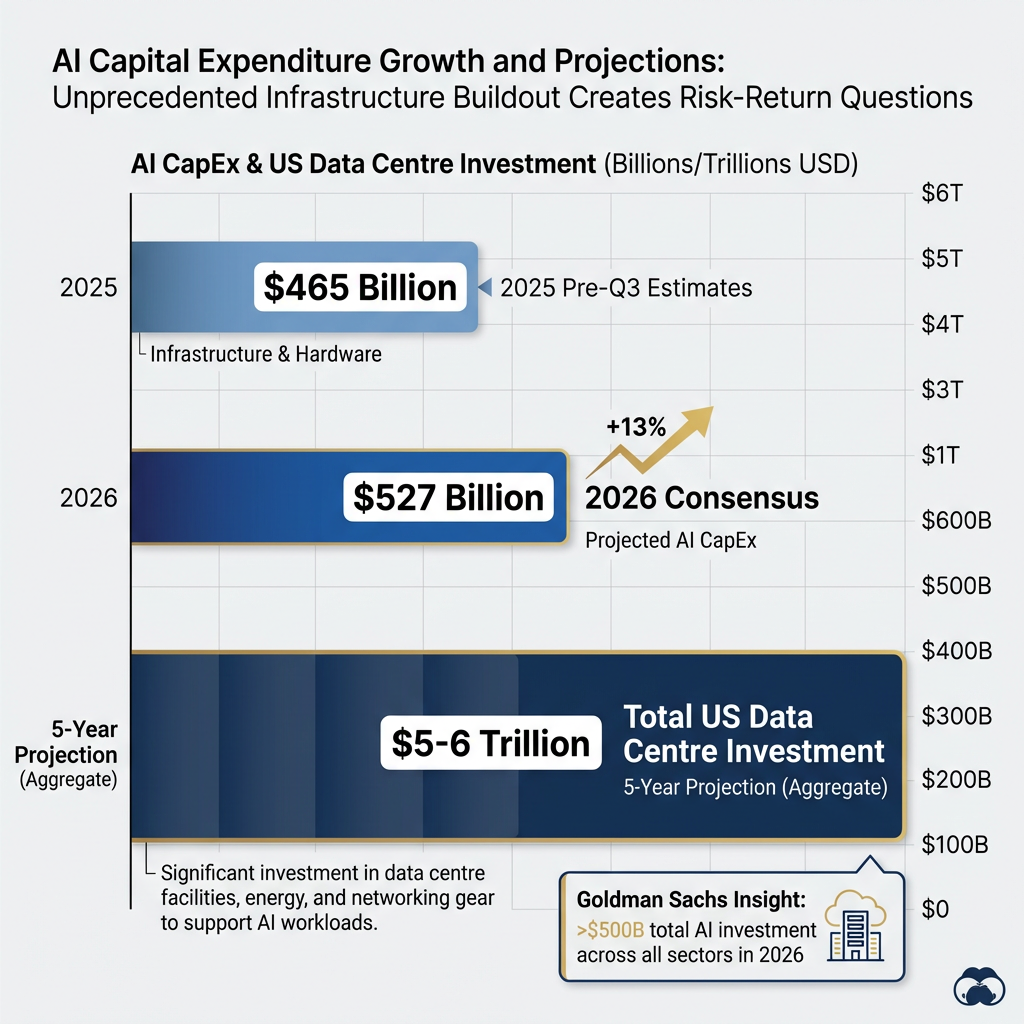 Consensus estimates for hyperscaler capital expenditure reached $527 billion in 2026, up from $465 billion in pre-Q3 2025 projections, with Goldman Sachs projecting over $500 billion in total AI investment across all sectors. Apollo Global Management estimates $5 trillion to $6 trillion in US data centre investment over the next five years.
