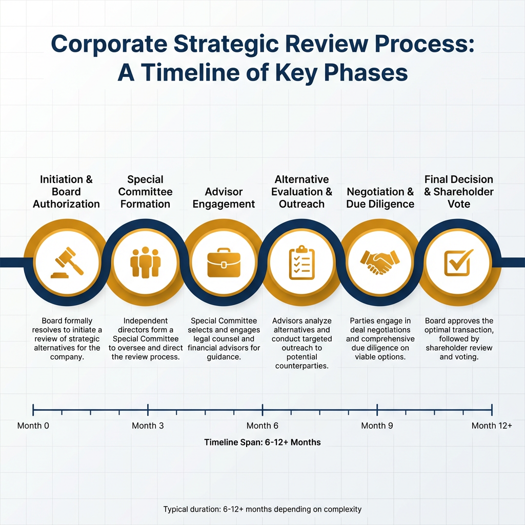 Strategic reviews typically require several months to a year or more to complete, depending on process complexity, the number of interested parties, and applicable regulatory requirements, while the company generally continues normal operations throughout the process.
