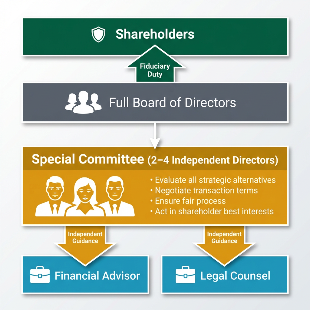 - Special Committees of independent directors lead the review to eliminate management conflicts of interest and carry fiduciary duties legally obligating them to act in shareholders' best interests.