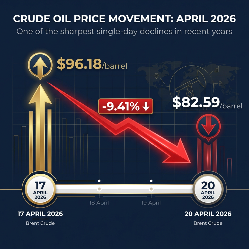 - Crude oil crashed 9.41% to $82.59 per barrel on 20 April 2026, one of the sharpest single-day declines in recent years, reversing a run that had pushed Brent to $96.18 just three days earlier.