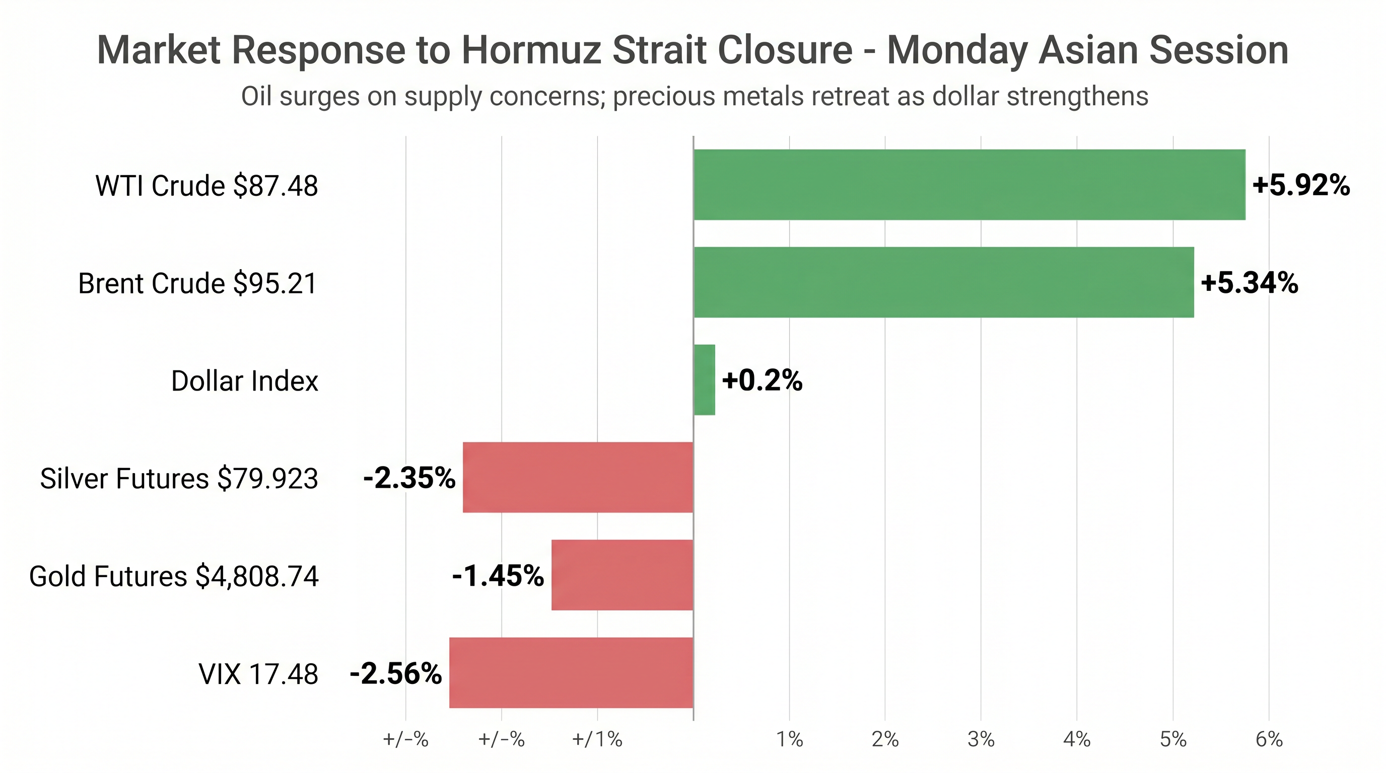 - WTI crude surged 5.92% to $87.48 and Brent climbed 5.34% to $95.21, while gold fell 1.45% and silver dropped 2.35%, illustrating classic geopolitical safe-haven rotation mechanics.