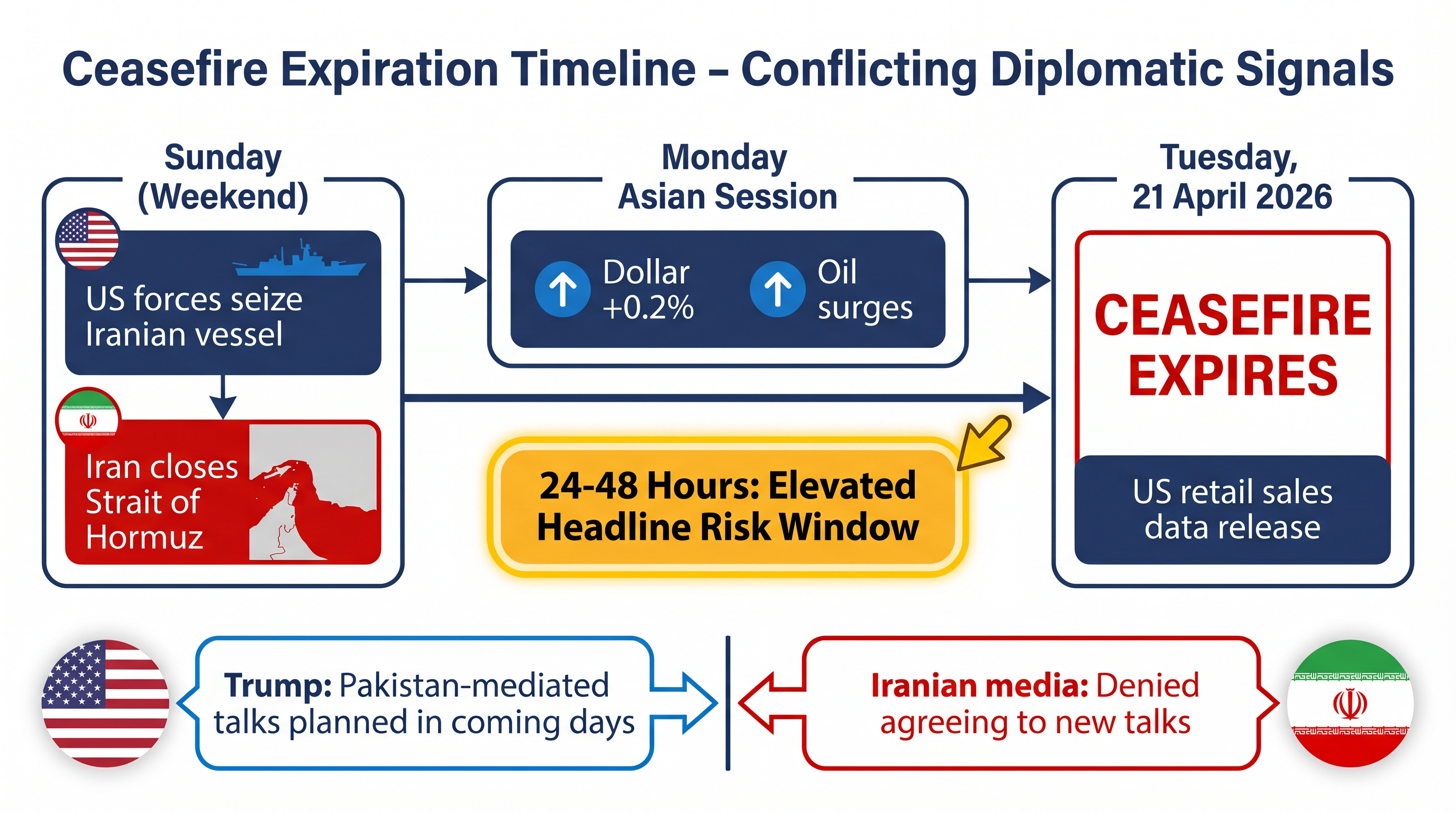 The ceasefire expires on Tuesday, 21 April 2026, less than 24 hours from the weekend’s vessel seizure. Traders cannot price in a clear resolution path when the two sides offer conflicting accounts of whether talks are even scheduled.