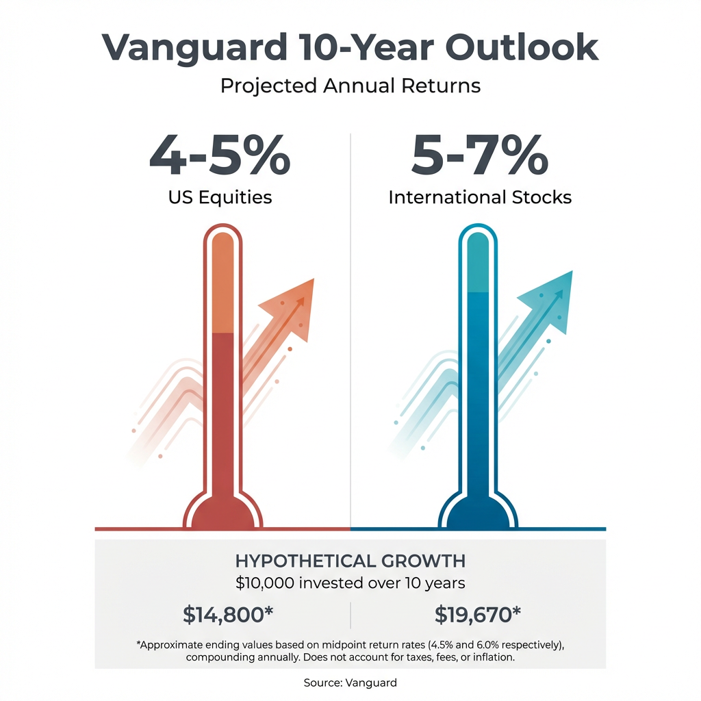 - Higher expected returns: Vanguard projects 5-7% annual returns for international stocks over the next decade compared to 4-5% for US equities, reflecting valuation gaps and earnings growth trajectories