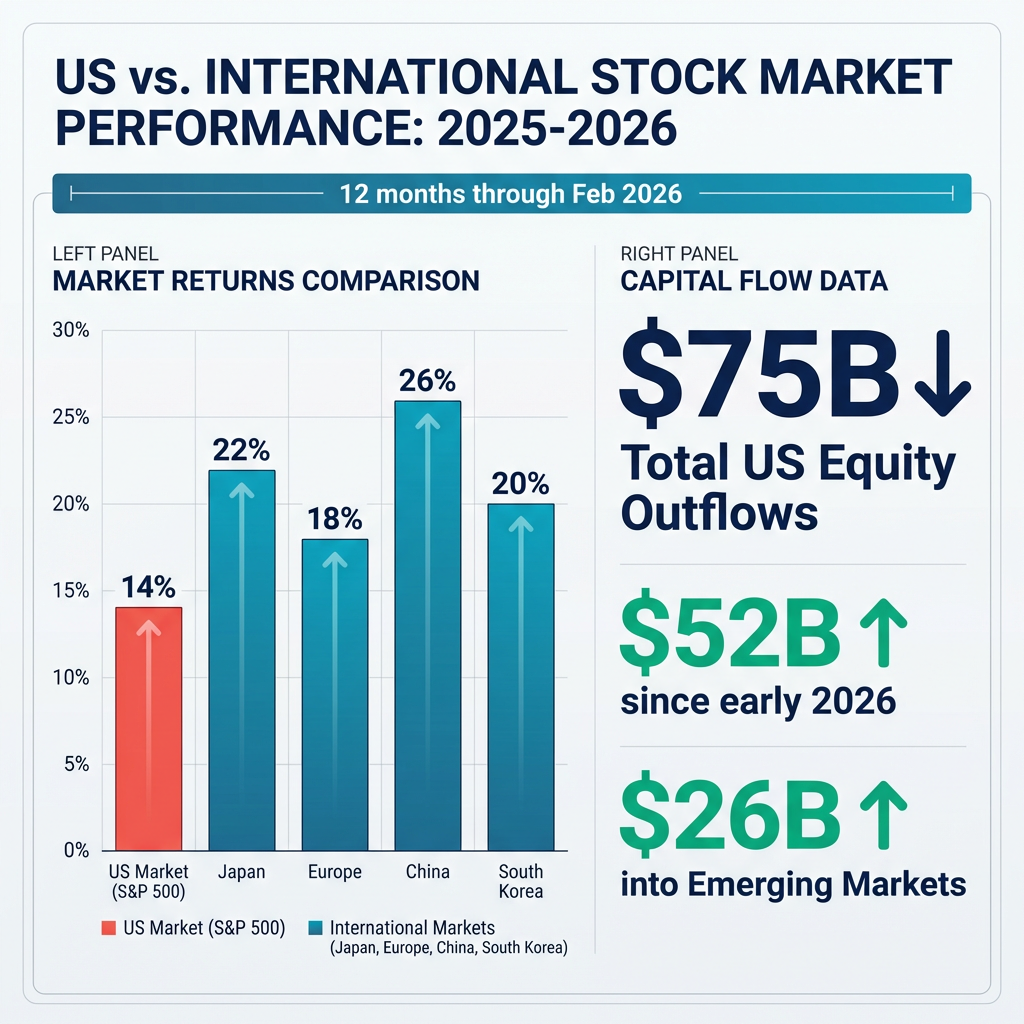 US investors are rotating billions of dollars into international stocks after watching overseas markets outperform domestic equities throughout 2025 and into 2026. The MSCI All Country World Index ex-USA outperformed the S&P 500 by double-digit percentage points in 2025, with the rally continuing robustly into early 2026. This performance gap has prompted a significant capital reallocation, with $75 billion withdrawn from US equity funds over six months through February 2026.