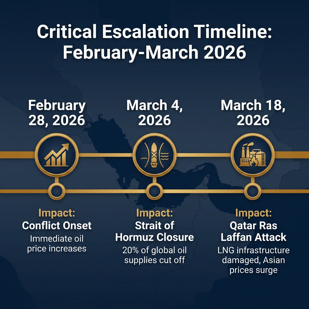 - February 28, 2026: Conflict onset, immediate oil price increases as markets priced geopolitical risk premium