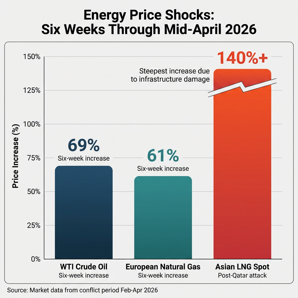 Asian LNG spot prices increased by over 140% following Iran's March 18, 2026 attack on Qatar's Ras Laffan Industrial City, while European natural gas rallied 61% over the same six-week period due to the damage to irreplaceable LNG infrastructure.