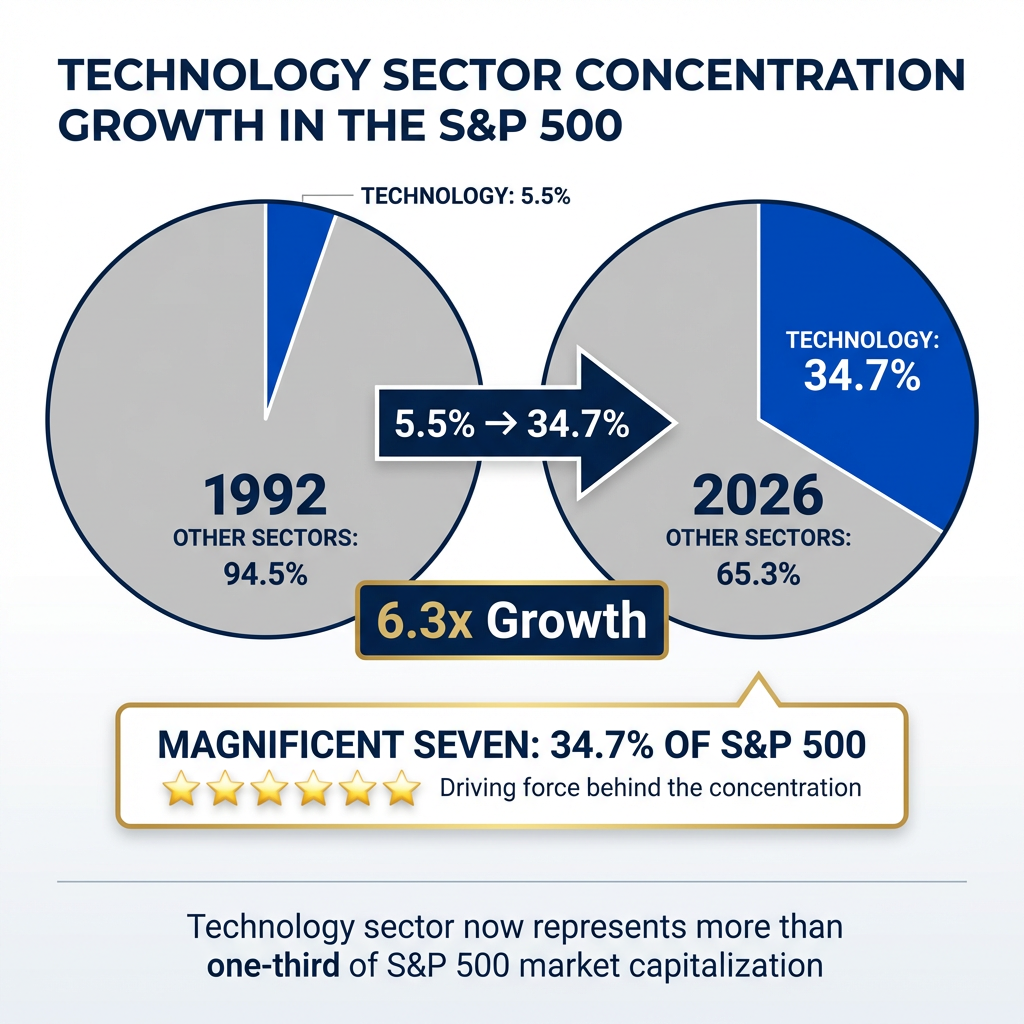 The technology sector now represents 34.7% of the S&P 500, compared to just 5.5% in 1992. This concentration means collective movements within the Magnificent Seven can swing the entire market, as demonstrated by the $870 billion loss in a single week ending 27 March 2026. When these companies rally or decline in unison, passive index investors and active fund managers alike feel the impact across portfolios.