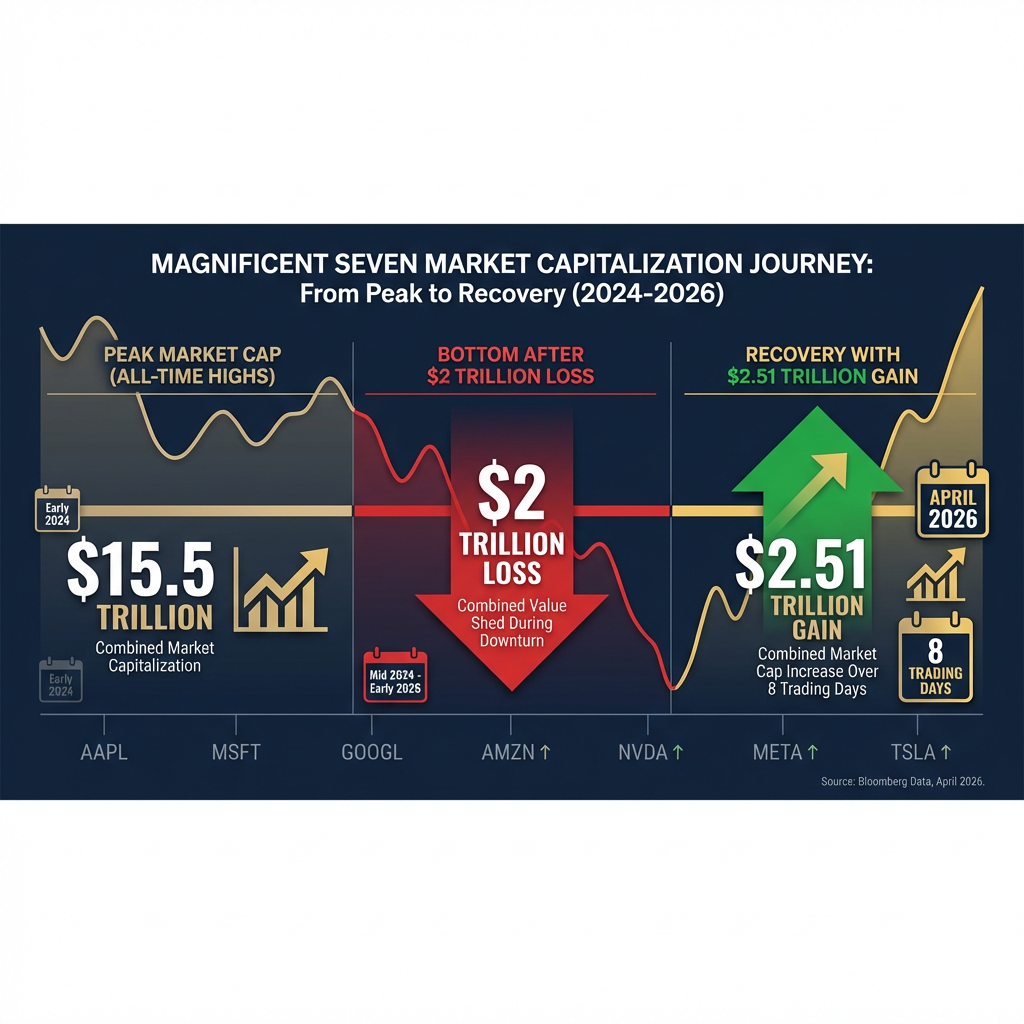 - The Magnificent Seven stocks added a record $2.51 trillion in combined market capitalisation over just eight trading days in April 2026, reversing losses that had exceeded $2 trillion from all-time highs.