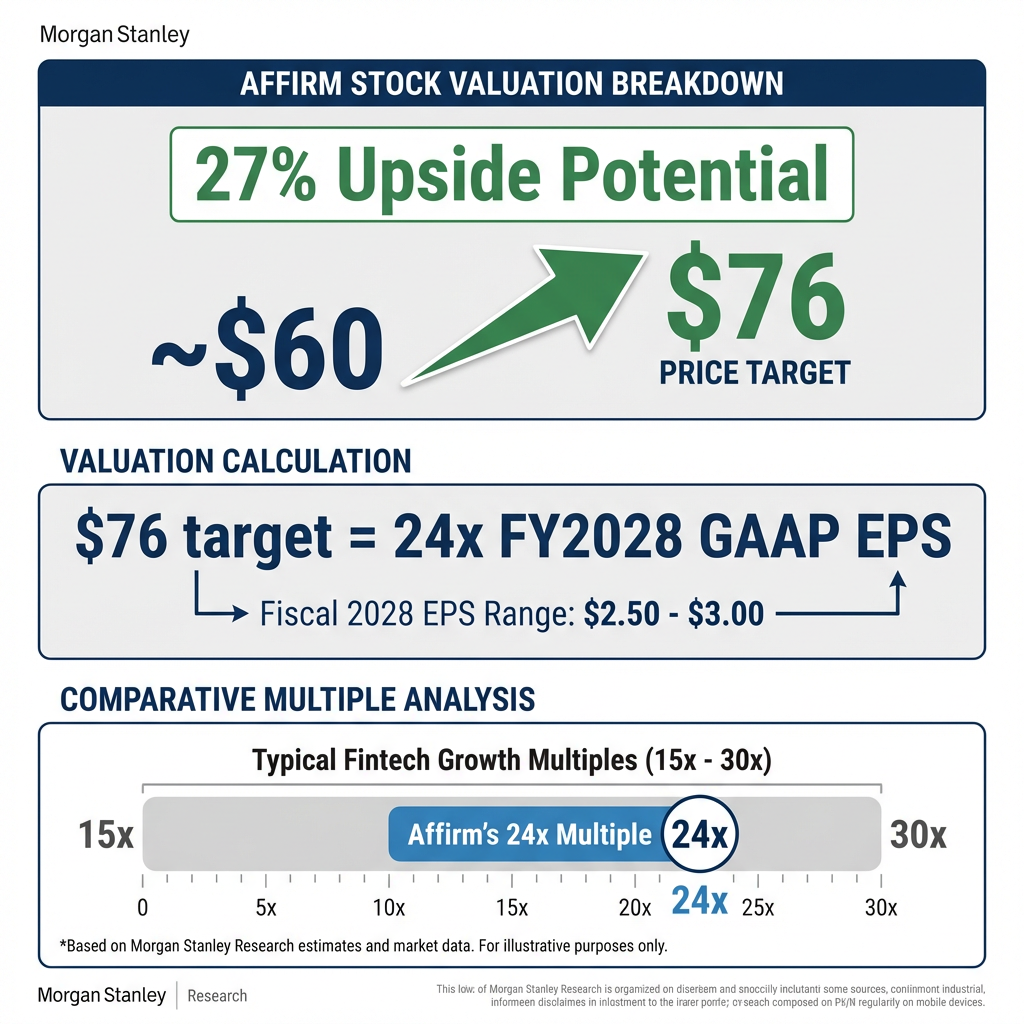 Morgan Stanley analyst James Faucette set a $76 price target for Affirm, implying approximately 27% upside from recent trading levels and a valuation of roughly 24 times fiscal 2028 GAAP earnings per share.