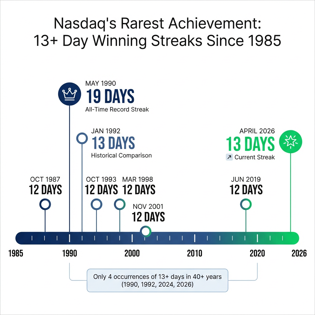 The all-time Nasdaq winning streak record stands at 19 consecutive positive days, set in May 1990. The current 13-day streak in April 2026 ranks as only the fourth occurrence of 13 or more consecutive positive days since 1985.