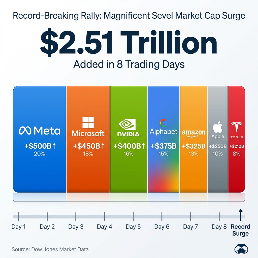 The Magnificent Seven stocks, Meta Platforms, Microsoft, Nvidia, Alphabet, Amazon, Apple, and Tesla, collectively added $2.51 trillion in market capitalisation across eight trading sessions. This represents an all-time record for that timeframe, according to Dow Jones Market Data.