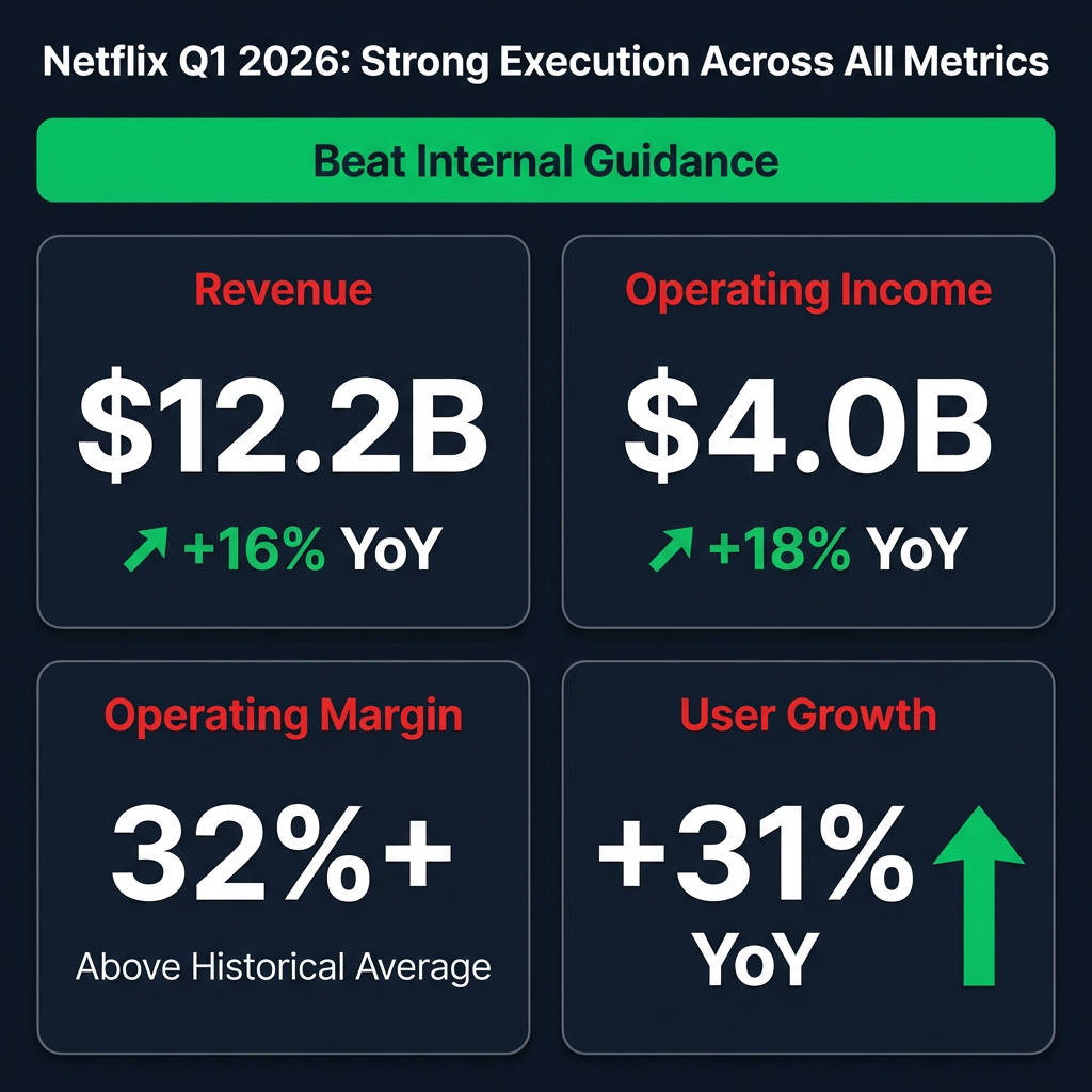 • Netflix Q1 2026 revenue grew 16% year-over-year to approximately $12.2 billion, beating internal guidance, with operating margins exceeding 32%.