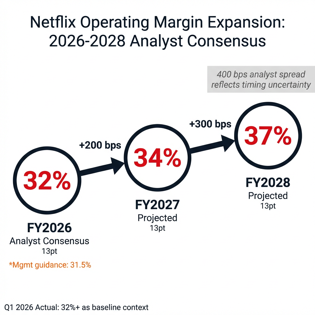 • Consensus projects operating margins expanding from 32% in 2026 to 37% by 2028, though a 400 basis point spread in analyst estimates reflects uncertainty around content expense timing.
