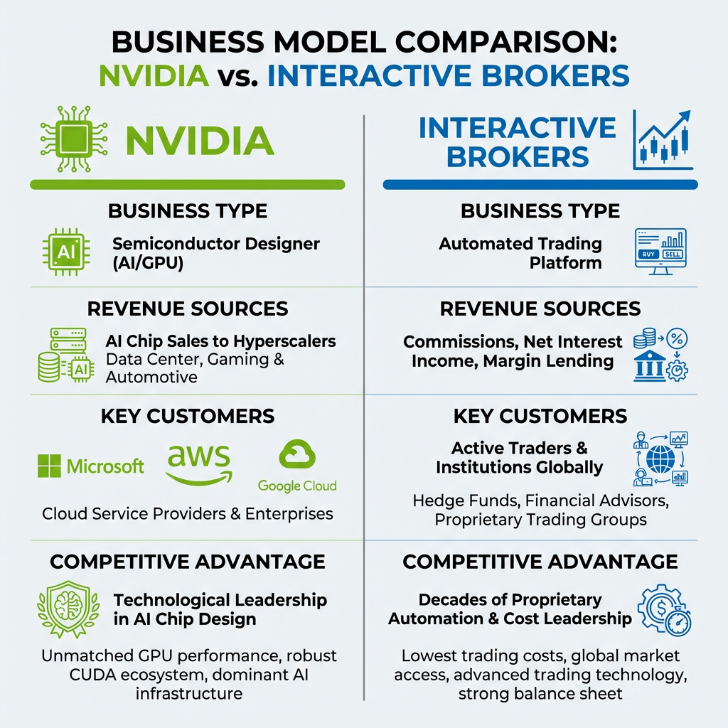 Nvidia suits investors with high risk tolerance who believe in continued AI infrastructure spending, while Interactive Brokers appeals to those seeking compounding growth through operational efficiency; holding both provides exposure to non-correlated growth archetypes within a diversified portfolio.