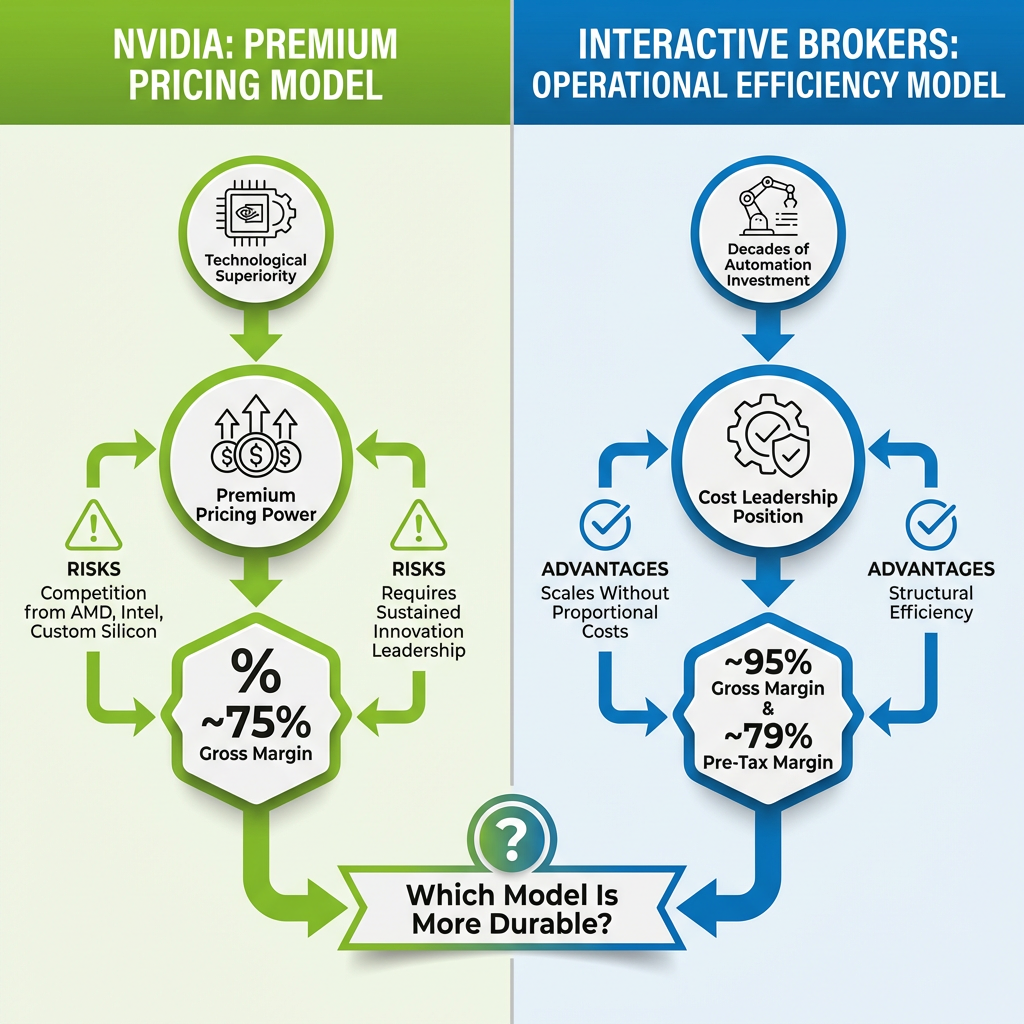 Interactive Brokers’ profitability stems from operational efficiency and competitive low-cost positioning built over decades, potentially offering more durable advantages than Nvidia’s premium pricing model dependent on maintaining technological superiority against well-capitalised competitors.