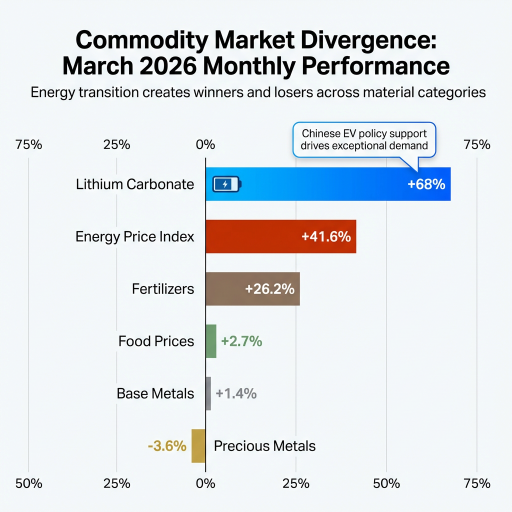 The lithium rally stems from Chinese policy changes effective April 2026 supporting electric vehicle production, creating exceptional demand for battery-grade materials. This divergence underscores the structural shift in commodity markets, where energy transition metals experience boom conditions even as traditional energy commodities face bearish pressure. The fragmentation reflects the global transition from fossil fuel dependence toward renewable energy systems, creating winners and losers across different material categories.