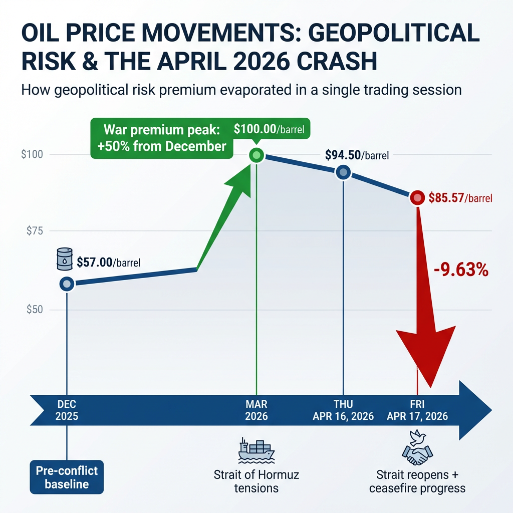 Crude oil prices crashed 9.63% on Friday, April 17, 2026, closing at $85.57 per barrel in one of the sharpest single-day declines this year. The collapse followed Iran’s declaration that the Strait of Hormuz had reopened and confirmation of progress in Persian Gulf ceasefire negotiations, eliminating the geopolitical risk premium that had inflated energy markets for weeks.