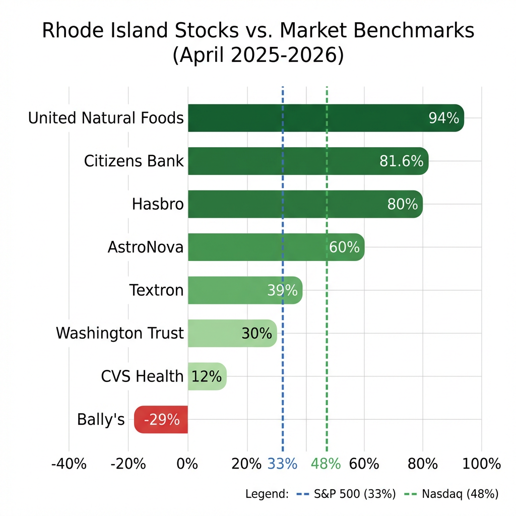 Rhode Island stocks surged in 2025–2026, with 7 of 8 publicly traded companies posting gains — five of which outpaced the S&P 500's 33% rally — making the state's diverse corporate roster a standout for investors seeking returns beyond the tech sector.