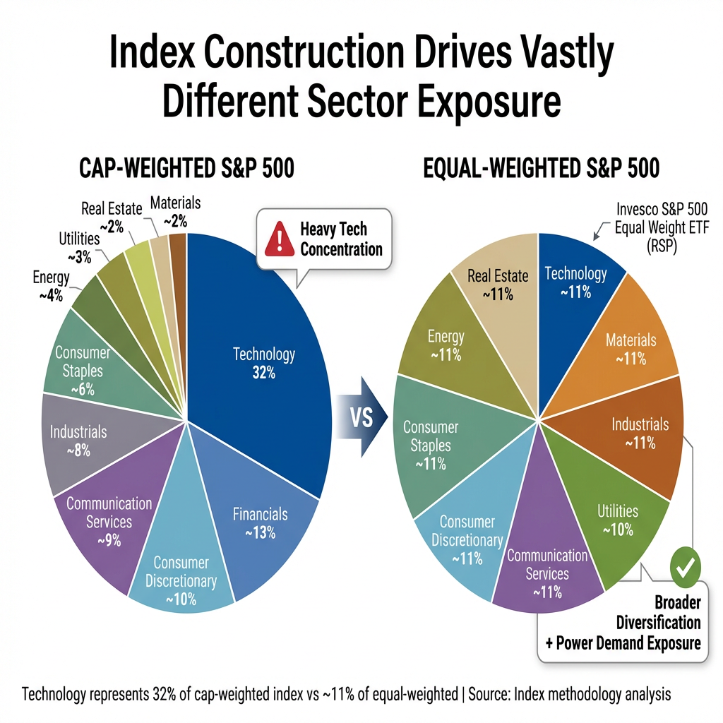 The equal-weighted S&P 500 assigns every constituent the same index influence regardless of market cap, reducing technology's roughly 32% dominance in the cap-weighted version and tilting exposure toward materials, industrials, and utilities sectors benefiting from AI infrastructure buildout demand.